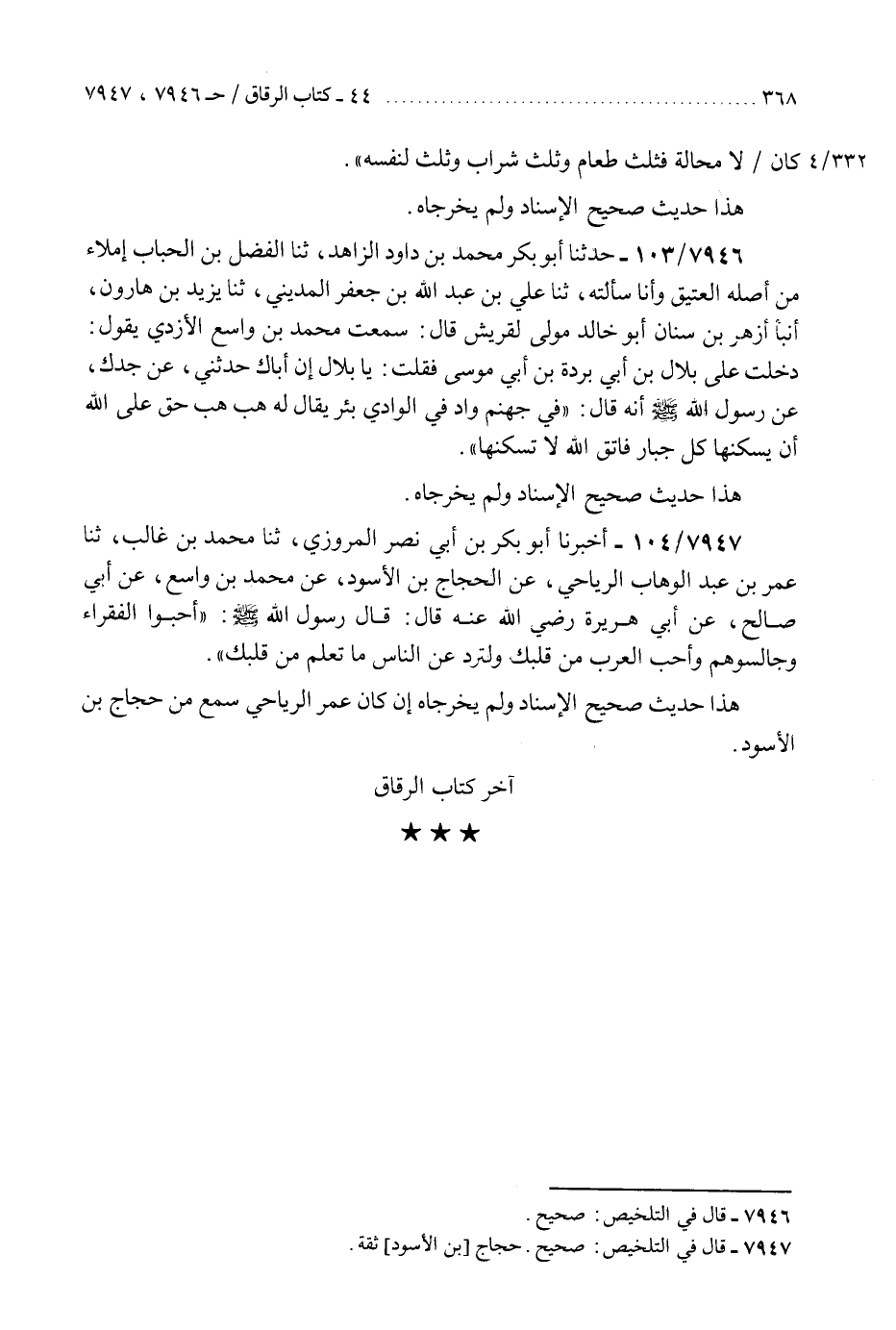 7947 - أَخْبَرَنَا أَبُو بَكْرِ بْنُ أَبِي نَصْرٍ الْمَرْوَزِيُّ، ثَنَا مُحَمَّدُ بْنُ غَالِبٍ، ثَنَا عُمَرُ بْنُ عَبْدِ الْوَهَّابِ الرِّيَاحِيُّ، عَنِ الْحَجَّاجِ بْنِ الْأَسْوَدِ، عَنْ مُحَمَّدِ بْنِ وَاسِعٍ، عَنْ أَبِي صَالِحٍ، عَنْ أَبِي هُرَيْرَةَ رَضِيَ اللَّهُ عَنْهُ قَالَ: قَالَ رَسُولُ اللَّهِ صَلَّى اللهُ عَلَيْهِ وَسَلَّمَ: §«أَحِبُّوا الْفُقَرَاءَ وَجَالِسُوهُمْ وَأَحِبَّ الْعَرَبَ مِنْ قَلْبِكَ وَلْتَرُدَّ عَنِ النَّاسِ مَا تَعْلَمُ مِنْ قَلْبِكَ» هَذَا حَدِيثٌ صَحِيحُ الْإِسْنَادِ وَلَمْ يُخَرِّجَاهُ إِنْ كَانَ عُمَرُ الرِّيَاحِيُّ سَمِعَ مِنْ حَجَّاجِ بْنِ الْأَسْوَدِ «آخِرُ كِتَابِ الرِّقَاقِ» K7947 - صحيح