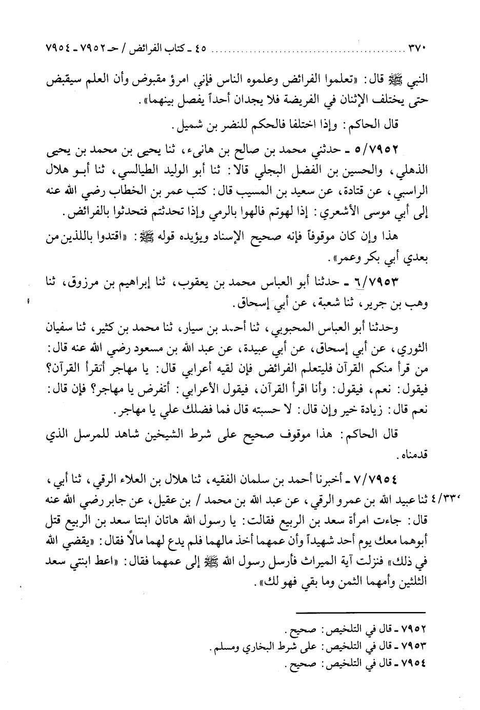 7953 - حَدَّثَنَا أَبُو الْعَبَّاسِ مُحَمَّدُ بْنُ يَعْقُوبَ، ثَنَا إِبْرَاهِيمُ بْنُ مَرْزُوقٍ، ثَنَا وَهْبُ بْنُ جَرِيرٍ، ثَنَا شُعْبَةُ، عَنْ أَبِي إِسْحَاقَ، وَحَدَّثَنَا أَبُو الْعَبَّاسِ الْمَحْبُوبِيُّ، ثَنَا أَحْمَدُ بْنُ سَيَّارٍ، ثَنَا مُحَمَّدُ بْنُ كَثِيرٍ، ثَنَا سُفْيَانُ الثَّوْرِيُّ، عَنْ أَبِي إِسْحَاقَ، عَنْ أَبِي عُبَيْدَةَ، عَنْ عَبْدِ اللَّهِ بْنِ مَسْعُودٍ، رَضِيَ اللَّهُ عَنْهُ قَالَ: §" مَنْ قَرَأَ مِنْكُمُ الْقُرْآنَ فَلْيَتَعَلَّمِ الْفَرَائِضَ فَإِنْ لَقِيَهُ أَعْرَابِيٌّ قَالَ: يَا مُهَاجِرُ، أَتَقْرَأُ الْقُرْآنَ؟ فَيَقُولُ: نَعَمْ، فَيَقُولُ: وَأَنَا أَقْرَأُ الْقُرْآنَ، فَيَقُولُ الْأَعْرَابِيُّ: أَتَفْرِضُ يَا مُهَاجِرُ؟ فَإِنْ قَالَ: نَعَمْ، قَالَ: زِيَادَةُ خَيْرٍ، وَإِنْ قَالَ: لَا، حَسِبْتُهُ قَالَ: فَمَا فَضَّلَكَ عَلَيَّ يَا مُهَاجِرُ " قَالَ الْحَاكِمُ: «هَذَا مَوْقُوفٌ صَحِيحٌ عَلَى شَرْطِ الشَّيْخَيْنِ شَاهِدٌ لِلْمُرْسَلِ الَّذِي قَدَّمْنَاهُ» K7953 - على شرط البخاري ومسلم