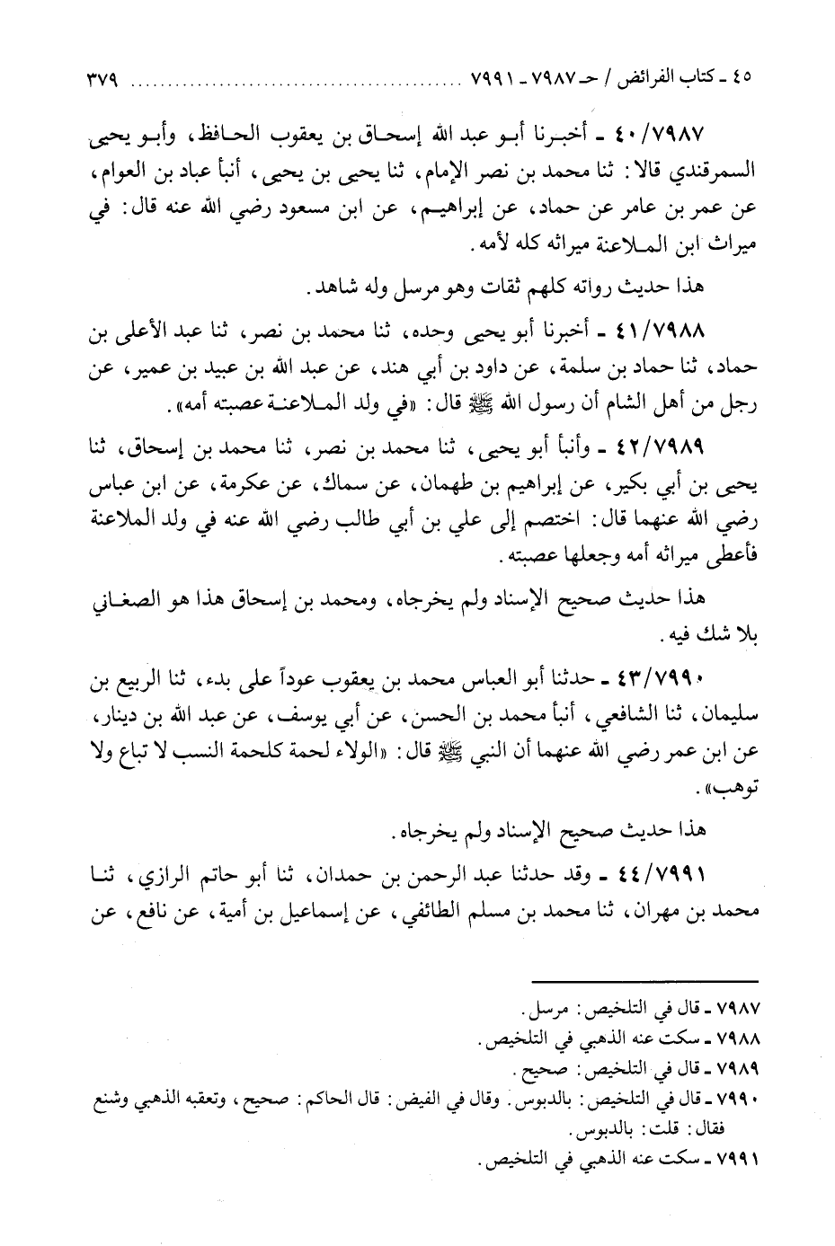 7991 - وَقَدْ حَدَّثَنَا عَبْدُ الرَّحْمَنِ بْنُ حَمْدَانَ، ثَنَا أَبُو حَاتِمٍ الرَّازِيُّ، ثَنَا مُحَمَّدُ بْنُ مِهْرَانَ، ثَنَا مُحَمَّدُ بْنُ مُسْلِمٍ الطَّائِفِيُّ، عَنْ إِسْمَاعِيلَ بْنِ أُمَيَّةَ، عَنْ نَافِعٍ، عَنِ ابْنِ عُمَرَ، رَضِيَ اللَّهُ عَنْهُمَا عَنِ النَّبِيِّ صَلَّى اللهُ عَلَيْهِ وَسَلَّمَ قَالَ: §«الْوَلَاءُ لُحْمَةٌ مِنَ النَّسَبِ لَا تُبَاعُ وَلَا تُوهَبُ» K7991 - سكت عنه الذهبي في التلخيص