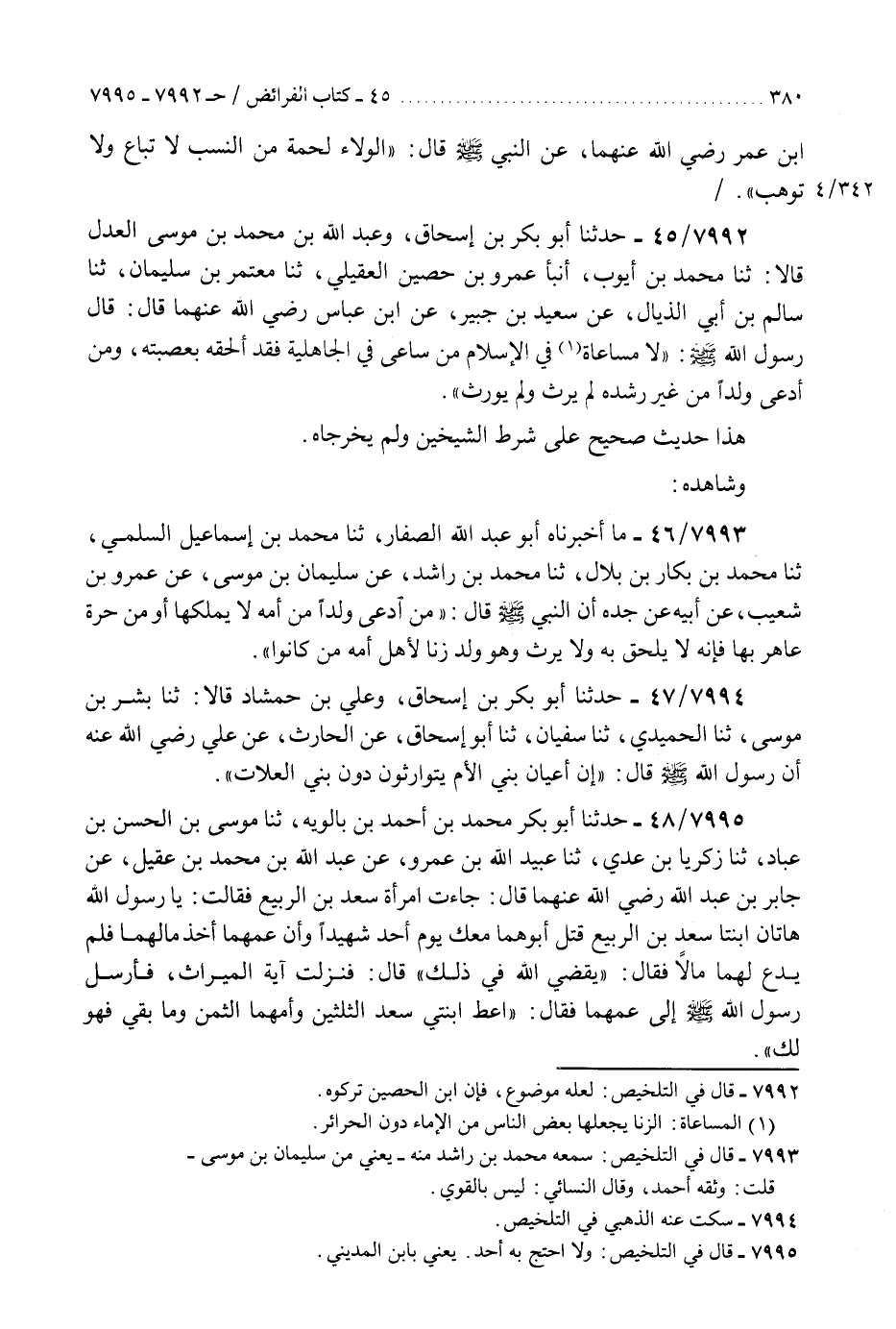 7992 - حَدَّثَنَا أَبُو بَكْرِ بْنُ إِسْحَاقَ، وَعَبْدُ اللَّهِ بْنُ مُحَمَّدِ بْنِ مُوسَى، الْعَدْلُ قَالَا: ثَنَا مُحَمَّدُ بْنُ أَيُّوبَ، أَنْبَأَ عَمْرُو بْنُ حُصَيْنٍ الْعُقَيْلِيُّ، ثَنَا مُعْتَمِرُ بْنُ سُلَيْمَانَ، ثَنَا سَالِمُ بْنُ أَبِي الذَّيَّالِ، عَنْ سَعِيدِ بْنِ جُبَيْرٍ، عَنِ ابْنِ عَبَّاسٍ، رَضِيَ اللَّهُ عَنْهُمَا قَالَ: قَالَ رَسُولُ اللَّهِ صَلَّى اللهُ عَلَيْهِ وَسَلَّمَ: §«لَا مُسَاعَاةَ فِي الْإِسْلَامِ مَنْ سَاعَى فِي الْجَاهِلِيَّةِ فَقَدْ أَلْحَقَهُ بِعَصَبَتِهِ، وَمَنِ ادَّعَى وَلَدًا مِنْ غَيْرِ رِشْدَةٍ لَمْ يَرِثْ وَلَمْ يُورَثْ» هَذَا حَدِيثٌ صَحِيحٌ عَلَى شَرْطِ الشَّيْخَيْنِ وَلَمْ يُخَرِّجَاهُ وَشَاهِدُهُ "K7992 - لعله موضوع