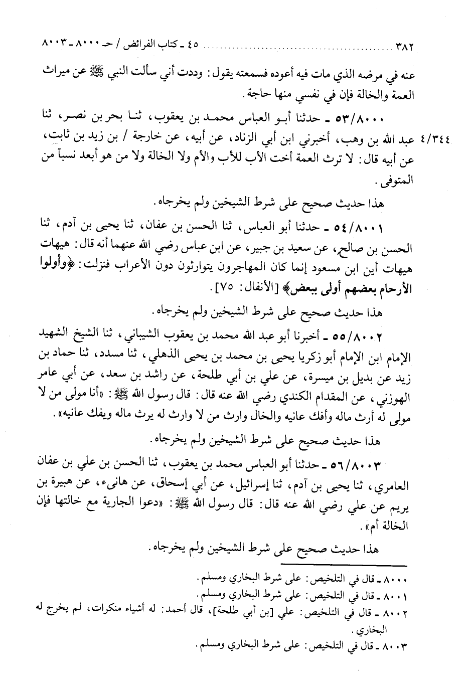 8002 - أَخْبَرَنَا أَبُو عَبْدِ اللَّهِ مُحَمَّدُ بْنُ يَعْقُوبَ الشَّيْبَانِيُّ، ثَنَا الشَّيْخُ الشَّهِيدُ الْإِمَامُ ابْنُ الْإِمَامِ أَبُو زَكَرِيَّا يَحْيَى بْنُ مُحَمَّدِ بْنِ يَحْيَى الذُّهْلِيُّ، ثَنَا مُسَدَّدٌ، ثَنَا حَمَّادُ بْنُ زَيْدٍ، عَنْ بُدَيْلِ بْنِ مَيْسَرَةَ، عَنْ عَلِيِّ بْنِ أَبِي طَلْحَةَ، عَنْ رَاشِدِ بْنِ سَعْدٍ، عَنْ أَبِي عَامِرٍ الْهَوْزَنِيِّ، عَنِ الْمِقْدَامِ الْكِنْدِيِّ رَضِيَ اللَّهُ عَنْهُ قَالَ: قَالَ رَسُولُ اللَّهِ صَلَّى اللهُ عَلَيْهِ وَسَلَّمَ: §«أَنَا مَوْلَى مَنْ لَا مَوْلَى لَهُ أَرِثُ مَالَهُ وَأَفُكُّ عَانِيَهُ، وَالْخَالُ وَارِثُ مَنْ لَا وَارِثَ لَهُ يَرِثُ مَالَهُ وَيَفُكُّ عَانِيَهُ» هَذَا حَدِيثٌ صَحِيحٌ عَلَى شَرْطِ الشَّيْخَيْنِ وَلَمْ يُخَرِّجَاهُ "K8002 - علي بن أبي طلحة قال أحمد له أشياء منكرات لم يخرج له البخاري