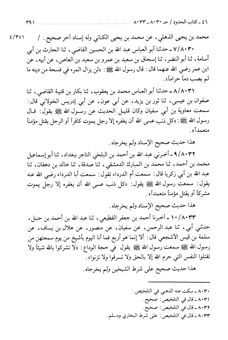 8031 - حَدَّثَنَا أَبُو الْعَبَّاسِ مُحَمَّدُ بْنُ يَعْقُوبَ، ثَنَا بَكَّارُ بْنُ قُتَيْبَةَ الْقَاضِي، ثَنَا صَفْوَانُ بْنُ عِيسَى، ثَنَا ثَوْرُ بْنُ يَزِيدَ، عَنْ أَبِي عَوْنٍ، عَنْ أَبِي إِدْرِيسَ الْخَوْلَانِيِّ، قَالَ: سَمِعْتُ مُعَاوِيَةَ بْنَ أَبِي سُفْيَانَ، وَكَانَ قَلِيلَ الْحَدِيثِ عَنْ رَسُولِ اللَّهِ صَلَّى اللهُ عَلَيْهِ وَسَلَّمَ يَقُولُ: قَالَ رَسُولُ اللَّهِ صَلَّى اللهُ عَلَيْهِ وَسَلَّمَ: §«كُلُّ ذَنْبٍ عَسَى اللَّهُ أَنْ يَغْفِرَهُ إِلَّا رَجُلٌ يَمُوتُ كَافِرًا أَوِ الرَّجُلُ يَقْتُلُ مُؤْمِنًا مُتَعَمِّدًا» هَذَا حَدِيثٌ صَحِيحُ الْإِسْنَادِ وَلَمْ يُخَرِّجَاهُ "K8031 - صحيح