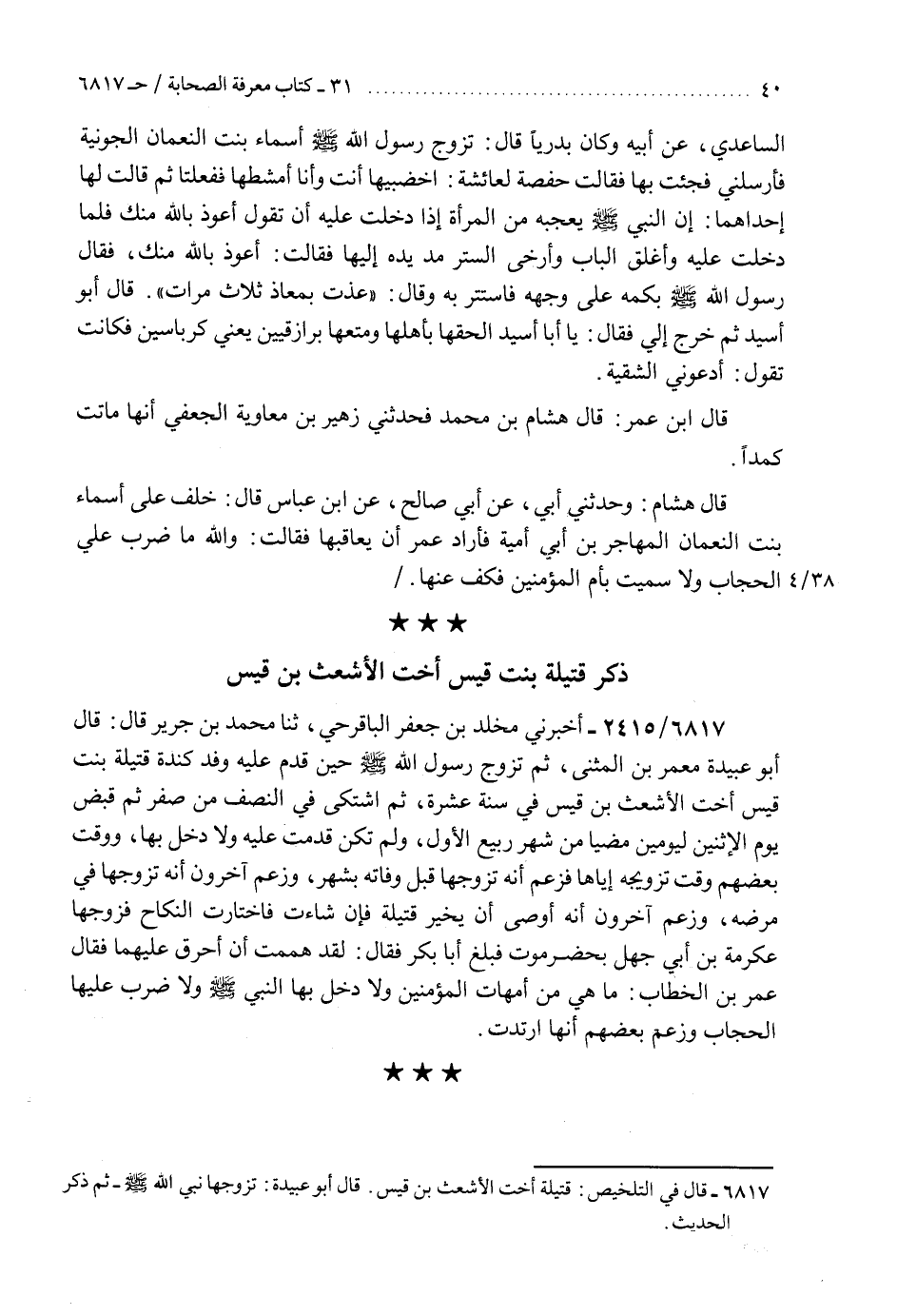 6817 - أَخْبَرَنِي مَخْلَدُ بْنُ جَعْفَرٍ الْبَاقَرْحِيُّ، ثَنَا مُحَمَّدُ بْنُ جَرِيرٍ، قَالَ: قَالَ أَبُوعُبَيْدَةَ مَعْمَرُ بْنُ الْمُثَنَّى: «ثُمَّ §تَزَوَّجَ رَسُولُ اللَّهِ صَلَّى اللهُ عَلَيْهِ وَسَلَّمَ حِينَ قَدِمَ عَلَيْهِ وَفْدُ كِنْدَةَ قُتَيْلَةَ بِنْتَ قَيْسٍ أُخْتَ الْأَشْعَثِ بْنِ قَيْسٍ فِي سَنَةِ عَشْرَةٍ، ثُمَّ اشْتَكَى فِي النِّصْفِ مِنْ صَفَرٍ، ثُمَّ قُبِضَ يَوْمَ الِاثْنَيْنِ لِيَوْمَيْنِ مَضَيَا مِنْ شَهْرِ رَبِيعٍ الْأَوَّلِ، وَلَمْ تَكُنٍ قَدِمَتْ عَلَيْهِ وَلَا دَخَلَ بِهَا» وَوَقَّتَ بَعْضُهُمْ وَقْتَ تَزْوِيجِهِ إِيَّاهَا، فَزَعَمَ أَنَّهُ تَزَوَّجَهَا قَبْلَ وَفَاتِهِ بِشَهْرٍ، وَزَعَمَ آخَرُونَ أَنَّهُ تَزَوَّجَهَا فِي مَرَضِهِ، وَزَعَمَ آخَرُونَ أَنَّهُ أَوْصَى أَنْ يُخَيِّرَ قُتَيْلَةَ فَإِنْ شَاءَتْ، فَاخْتَارَتِ النِّكَاحَ، فَزُوِّجَهَا عِكْرِمَةُ بْنُ أَبِي جَهْلٍ بِحَضْرَمَوْتَ، فَبَلَغَ أَبَا بَكْرٍ فَقَالَ: لَقَدْ هَمَمْتُ أَنْ أُحَرِّقَ عَلَيْهِمَا، فَقَالَ عُمَرُ بْنُ الْخَطَّابِ: مَا هِيَ مِنْ أُمَّهَاتِ الْمُؤْمِنِينَ وَلَا دَخَلَ بِهَا النَّبِيُّ صَلَّى اللهُ عَلَيْهِ وَسَلَّمَ وَلَا ضَرَبَ عَلَيْهَا الْحِجَابَ، وَزَعَمَ بَعْضُهُمْ أَنَّهَا ارْتَدَّتْ