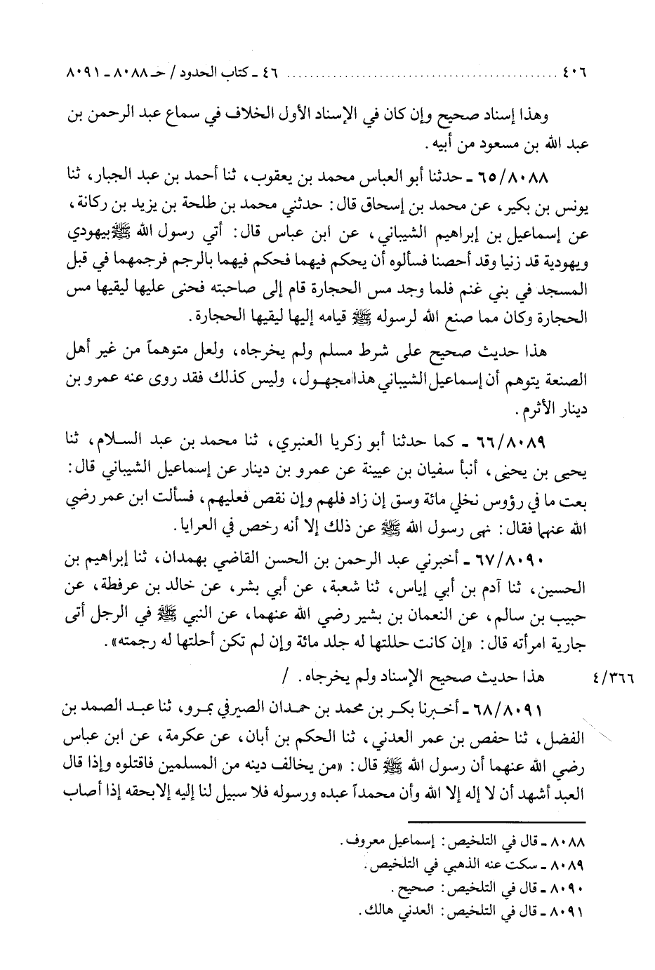 8088 - حَدَّثَنَا أَبُو الْعَبَّاسِ مُحَمَّدُ بْنُ يَعْقُوبَ، ثَنَا أَحْمَدُ بْنُ عَبْدِ الْجَبَّارِ، ثَنَا يُونُسُ بْنُ بُكَيْرٍ، عَنْ مُحَمَّدِ بْنِ إِسْحَاقَ، قَالَ: حَدَّثَنِي مُحَمَّدُ بْنُ طَلْحَةَ بْنِ يَزِيدَ بْنِ رُكَانَةَ، عَنْ إِسْمَاعِيلَ بْنِ إِبْرَاهِيمَ الشَّيْبَانِيِّ، عَنِ ابْنِ عَبَّاسٍ، قَالَ: «أُتِيَ رَسُولُ اللَّهِ صَلَّى اللهُ عَلَيْهِ وَسَلَّمَ بِيَهُودِيٍّ وَيَهُودِيَّةٍ قَدْ زَنَيَا وَقَدْ أُحْصِنَا فَسَأَلُوهُ أَنْ يَحْكُمَ فِيهِمَا فَحَكَمَ فِيهِمَا بِالرَّجْمِ §فَرَجَمَهُمَا فِي قُبُلِ الْمَسْجِدِ فِي بَنِي غَنْمٍ، فَلَمَّا وَجَدَ مَسَّ الْحِجَارَةِ قَامَ إِلَى صَاحَبْتِهِ فَحَنَى عَلَيْهَا لِيَقِيَهَا مَسَّ الْحِجَارَةِ وَكَانَ مِمَّا صَنَعَ اللَّهُ لِرَسُولِهِ صَلَّى اللهُ عَلَيْهِ وَسَلَّمَ قِيَامَهُ إِلَيْهَا لِيَقِيَهَا الْحِجَارَةَ» هَذَا حَدِيثٌ صَحِيحٌ عَلَى شَرْطِ مُسْلِمٍ وَلَمْ يُخَرِّجَاهُ، وَلَعَلَّ مُتَوَهِّمًا مِنْ غَيْرِ أَهْلِ الصَّنْعَةِ يَتَوَهَّمَ أَنَّ إِسْمَاعِيلَ الشَّيْبَانِيَّ هَذَا مَجْهُولٌ، وَلَيْسَ كَذَلِكَ فَقَدْ رَوَى عَنْهُ عَمْرُو بْنُ دِينَارٍ الْأَثْرَمُ "