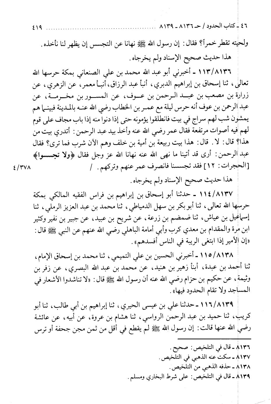 8138 - أَخْبَرَنِي الْحُسَيْنُ بْنُ عَلِيٍّ التَّمِيمِيُّ، ثَنَا مُحَمَّدُ بْنُ إِسْحَاقَ الْإِمَامُ، ثَنَا أَحْمَدُ بْنُ عَبْدَةَ، أَنْبَأَ زُهَيْرُ بْنُ هُنَيْدٍ، عَنْ مُحَمَّدِ بْنِ عَبْدِ اللَّهِ الْبَصْرِيِّ، عَنْ زُفَرَ بْنِ وَثِيمَةَ، عَنْ حَكِيمِ بْنِ حِزَامٍ رَضِيَ اللَّهُ عَنْهُ، أَنَّ رَسُولَ اللَّهِ صَلَّى اللهُ عَلَيْهِ وَسَلَّمَ قَالَ: §«لَا تَنَاشَدُوا الْأَشْعَارَ فِي الْمَسَاجِدِ وَلَا تُقَامُ الْحُدُودُ فِيهَا» K8138 - حذفه الذهبي من التلخيص