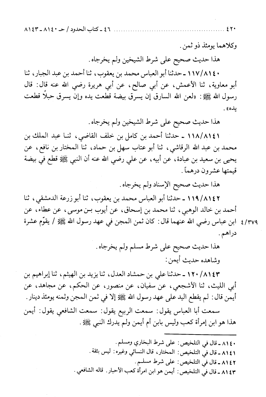 8143 - حَدَّثَنَا عَلِيُّ بْنُ حَمْشَاذٍ، الْعَدْلُ، ثَنَا يَزِيدُ بْنُ الْهَيْثَمِ، ثَنَا إِبْرَاهِيمُ بْنُ أَبِي اللَّيْثِ، ثَنَا الْأَشْجَعِيُّ، عَنْ سُفْيَانَ، عَنْ مَنْصُورٍ، عَنِ الْحَكَمِ، عَنْ مُجَاهِدٍ، عَنْ أَيْمَنَ، قَالَ: §«لَمْ يُقْطَعِ الْيَدُ عَلَى عَهْدِ رَسُولِ اللَّهِ صَلَّى اللهُ عَلَيْهِ وَسَلَّمَ إِلَّا فِي ثَمَنِ الْمِجَنِّ وَثَمَنُهُ يَوْمَئِذٍ دِينَارٌ» سَمِعْتُ أَبَا الْعَبَّاسِ، يَقُولُ: سَمِعْتُ الرَّبِيعَ، يَقُولُ: سَمِعْتُ الشَّافِعِيَّ، يَقُولُ: «أَيْمَنُ هَذَا هُوَ ابْنُ امْرَأَةِ كَعْبٍ وَلَيْسَ بِابْنِ أُمِّ أَيْمَنَ وَلَمْ يُدْرِكِ النَّبِيَّ صَلَّى اللهُ عَلَيْهِ وَسَلَّمَ» قَالَ الْحَاكِمُ: «وَالدَّلِيلُ عَلَى صِحَّةِ قَوْلِ الْإِمَامِ الشَّافِعِيِّ رَضِيَ اللَّهُ عَنْهُ»