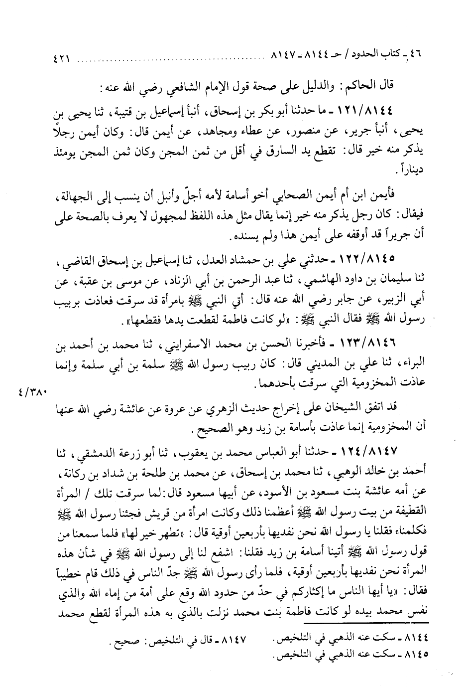 8146 - فَأَخْبَرَنَا الْحَسَنُ بْنُ مُحَمَّدٍ الِإِسْفَرَائِينِيُّ، ثَنَا مُحَمَّدُ بْنُ أَحْمَدَ بْنِ الْبَرَاءِ، ثَنَا عَلِيُّ بْنُ الْمَدِينِيِّ، قَالَ: «كَانَ رَبِيبُ رَسُولِ اللَّهِ صَلَّى اللهُ عَلَيْهِ وَسَلَّمَ سَلَمَةَ بْنَ أَبِي سَلَمَةَ وَإِنَّمَا عَاذَتِ الْمَخْزُومِيَّةُ الَّتِي سَرَقَتْ بِأَحَدِهِمَا» قَدِ اتَّفَقَ الشَّيْخَانِ عَلَى إِخْرَاجِ حَدِيثِ الزُّهْرِيِّ، عَنْ عُرْوَةَ، عَنْ عَائِشَةَ رَضِيَ اللَّهُ عَنْهَا، أَنَّ الْمَخْزُومِيَّةَ إِنَّمَا عَاذَتْ بِأُسَامَةَ بْنِ زَيْدٍ وَهُوَ الصَّحِيحُ "K8145 - سكت عنه الذهبي في التلخيص