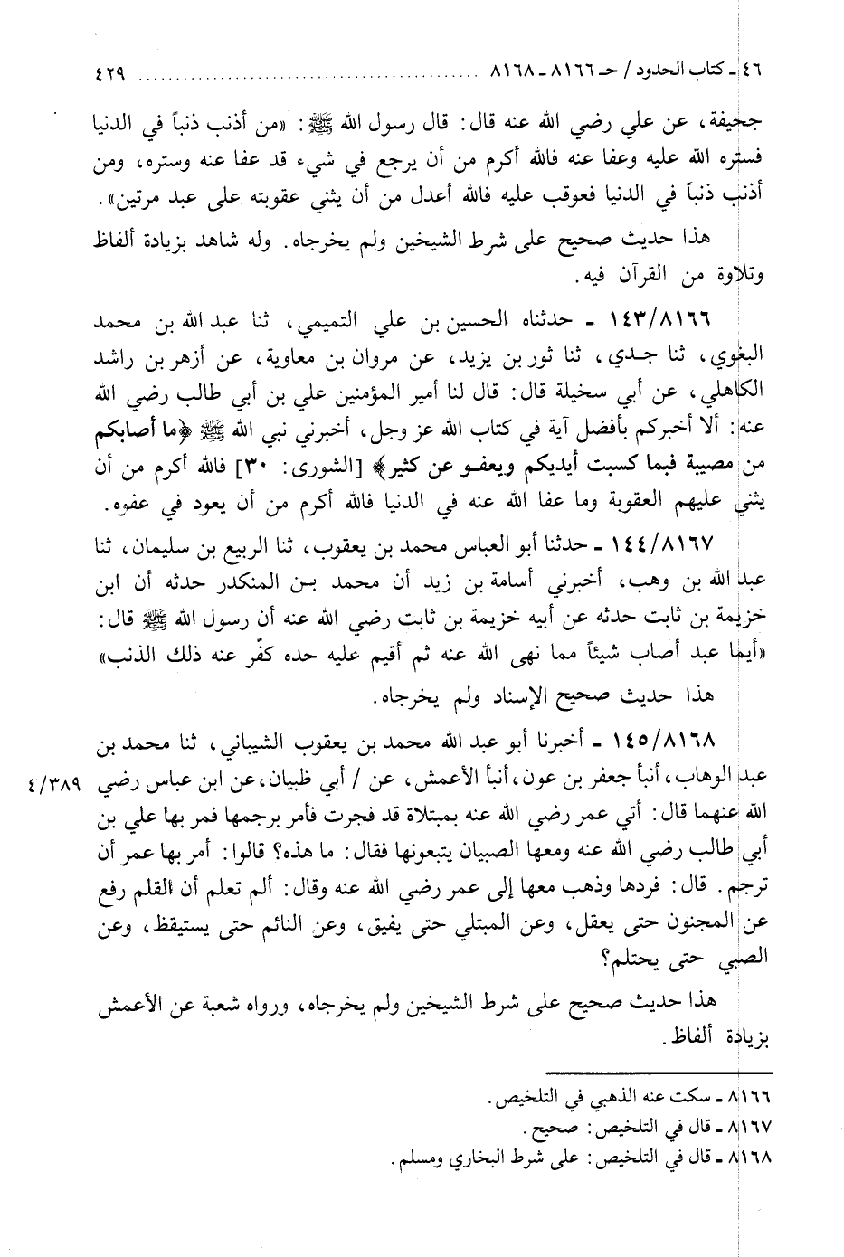 8168 - أَخْبَرَنَا أَبُو عَبْدِ اللَّهِ مُحَمَّدُ بْنُ يَعْقُوبَ الشَّيْبَانِيُّ، ثَنَا مُحَمَّدُ بْنُ عَبْدِ الْوَهَّابِ، أَنْبَأَ جَعْفَرُ بْنُ عَوْنٍ، أَنْبَأَ الْأَعْمَشُ، عَنْ أَبِي ظَبْيَانَ، عَنِ ابْنِ عَبَّاسٍ، رَضِيَ اللَّهُ عَنْهُمَا قَالَ: أُتِيَ عُمَرُ رَضِيَ اللَّهُ عَنْهُ بِمُبْتَلَاةٍ قَدْ فَجَرَتْ فَأَمَرَ بِرَجْمِهَا، فَمَرَّ بِهَا عَلِيُّ بْنُ أَبِي طَالِبٍ رَضِيَ اللَّهُ عَنْهُ وَمَعَهَا الصِّبْيَانُ يَتْبَعُونَهَا، فَقَالَ: «مَا هَذِهِ؟» قَالُوا: أَمَرَ بِهَا عُمَرُ أَنْ تُرْجَمَ، قَالَ: فَرَدَّهَا وَذَهَبَ مَعَهَا إِلَى عُمَرَ رَضِيَ اللَّهُ عَنْهُ وَقَالَ: «أَلَمْ تَعْلَمْ أَنَّ §الْقَلَمَ رُفِعَ عَنِ الْمَجْنُونِ حَتَّى يَعْقِلَ، وَعَنِ الْمُبْتَلَى حَتَّى يُفِيقَ، وَعَنِ النَّائِمِ حَتَّى يَسْتَيْقِظَ، وَعَنِ الصَّبِيِّ حَتَّى يَحْتَلِمَ» هَذَا حَدِيثٌ صَحِيحٌ عَلَى شَرْطِ الشَّيْخَيْنِ وَلَمْ يُخَرِّجَاهُ " وَرَوَاهُ شُعْبَةُ، عَنِ الْأَعْمَشِ بِزِيَادَةِ أَلْفَاظٍK8168 - على شرط البخاري ومسلم