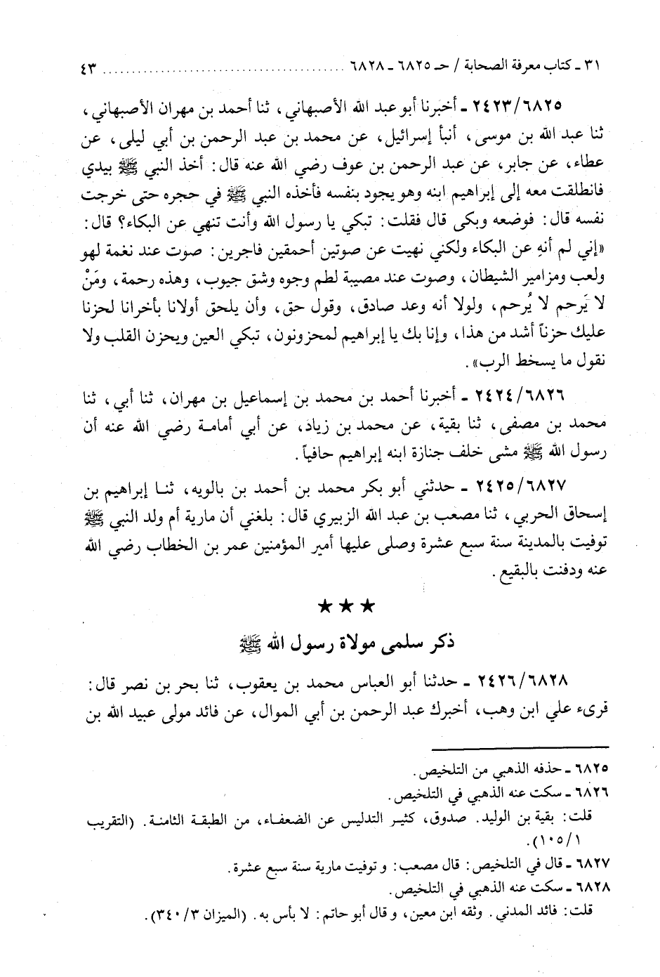 6827 - حَدَّثَنِي أَبُو بَكْرٍ مُحَمَّدُ بْنُ أَحْمَدَ بْنِ بَالَوَيْهِ، ثَنَا إِبْرَاهِيمُ بْنُ إِسْحَاقَ الْحَرْبِيُّ، ثَنَا مُصْعَبُ بْنُ عَبْدِ اللَّهِ الزُّبَيْرِيُّ، قَالَ: «بَلَغَنِي أَنَّ §مَارِيَةَ أُمَّ وَلَدِ النَّبِيِّ صَلَّى اللهُ عَلَيْهِ وَسَلَّمَ تُوُفِّيَتْ بِالْمَدِينَةِ سَنَةَ سَبْعَ عَشْرَةَ، وَصَلَّى عَلَيْهَا أَمِيرُ الْمُؤْمِنِينَ عُمَرُ بْنُ الْخَطَّابِ رَضِيَ اللَّهُ عَنْهُ، وَدُفِنَتْ بِالْبَقِيعِ»