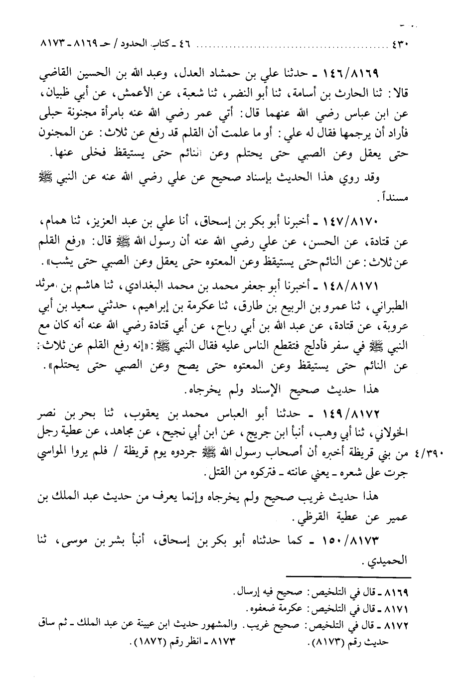 8169 - حَدَّثَنَا عَلِيُّ بْنُ حَمْشَاذَ الْعَدْلُ، وَعَبْدُ اللَّهِ بْنُ الْحُسَيْنِ الْقَاضِي، قَالَا: ثَنَا الْحَارِثُ بْنُ أَبِي أُسَامَةَ، ثَنَا أَبُو النَّضْرِ، ثَنَا شُعْبَةُ، عَنِ الْأَعْمَشِ، عَنْ أَبِي ظَبْيَانَ، عَنِ ابْنِ عَبَّاسٍ، رَضِيَ اللَّهُ عَنْهُمَا قَالَ: أُتِيَ عُمَرُ رَضِيَ اللَّهُ عَنْهُ بِامْرَأَةٍ مَجْنُونَةٍ حُبْلَى فَأَرَادَ أَنْ يَرْجُمَهَا، فَقَالَ لَهُ عَلِيٌّ: " أَوَمَا عَلِمْتَ أَنَّ §الْقَلَمَ قَدْ رُفِعَ عَنْ ثَلَاثٍ: عَنِ الْمَجْنُونِ حَتَّى يَعْقِلَ، وَعَنِ الصَّبِيِّ حَتَّى يَحْتَلِمَ، وَعَنِ النَّائِمِ حَتَّى يَسْتَيْقِظَ «فَخَلَّى عَنْهَا» وَقَدْ رُوِيَ هَذَا الْحَدِيثُ بِإِسْنَادٍ صَحِيحٍ عَنْ عَلِيٍّ رَضِيَ اللَّهُ عَنْهُ، عَنِ النَّبِيِّ صَلَّى اللهُ عَلَيْهِ وَسَلَّمَ مُسْنَدًا "K8169 - صحيح فيه إرسال