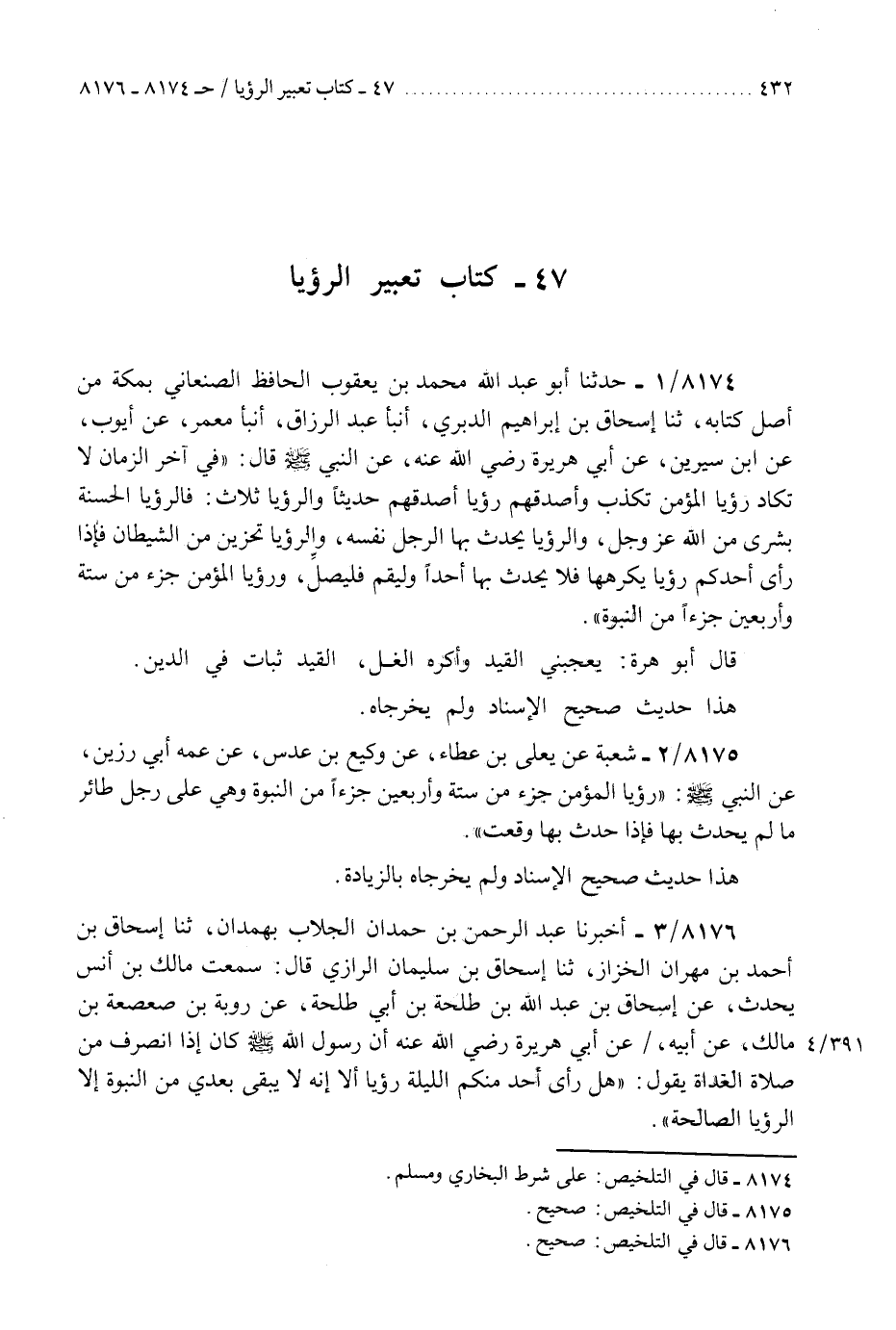 8174 - حَدَّثَنَا أَبُو عَبْدِ اللَّهِ مُحَمَّدُ بْنُ يَعْقُوبَ الْحَافِظُ الصَّنْعَانِيُّ، بِمَكَّةَ مِنْ أَصْلِ كِتَابِهِ، ثَنَا إِسْحَاقُ بْنُ إِبْرَاهِيمَ الدَّبَرِيُّ، أَنْبَأَ عَبْدُ الرَّزَّاقِ، أَنْبَأَ مَعْمَرٌ، عَنْ أَيُّوبَ، عَنِ ابْنِ سِيرِينَ، عَنْ أَبِي هُرَيْرَةَ رَضِيَ اللَّهُ عَنْهُ، عَنِ النَّبِيِّ صَلَّى اللهُ عَلَيْهِ وَسَلَّمَ قَالَ: §" فِي آخِرِ الزَّمَانِ لَا تَكَادُ رُؤْيَا الْمُؤْمِنِ تَكْذِبُ وَأَصْدَقُهُمْ رُؤْيَا أَصْدَقُهُمْ حَدِيثًا، وَالرُّؤْيَا ثَلَاثٌ: فَالرُّؤْيَا الْحَسَنَةُ بُشْرَى مِنَ اللَّهِ عَزَّ وَجَلَّ، وَالرُّؤْيَا يُحَدِّثُ بِهَا الرَّجُلُ نَفْسَهُ، وَالرُّؤْيَا تَحْزِينٌ مِنَ الشَّيْطَانِ، فَإِذَا رَأَى أَحَدُكُمْ رُؤْيَا يَكْرَهُهَا فَلَا يُحَدِّثْ بِهَا أَحَدًا وَلْيَقُمْ فَلْيُصَلِّ، وَرُؤْيَا الْمُؤْمِنِ جُزْءٌ مِنْ سِتَّةٍ وَأَرْبَعِينَ جُزْءًا مِنَ النُّبُوَّةِ " قَالَ أَبُو هُرَيْرَةَ: «يُعْجِبُنِي الْقَيْدُ وَأَكْرَهُ الْغُلَّ، الْقَيْدُ ثَبَاتٌ فِي الدِّينِ» هَذَا حَدِيثٌ صَحِيحُ الْإِسْنَادِ وَلَمْ يُخَرِّجَاهُ "K8174 - على شرط البخاري ومسلم
