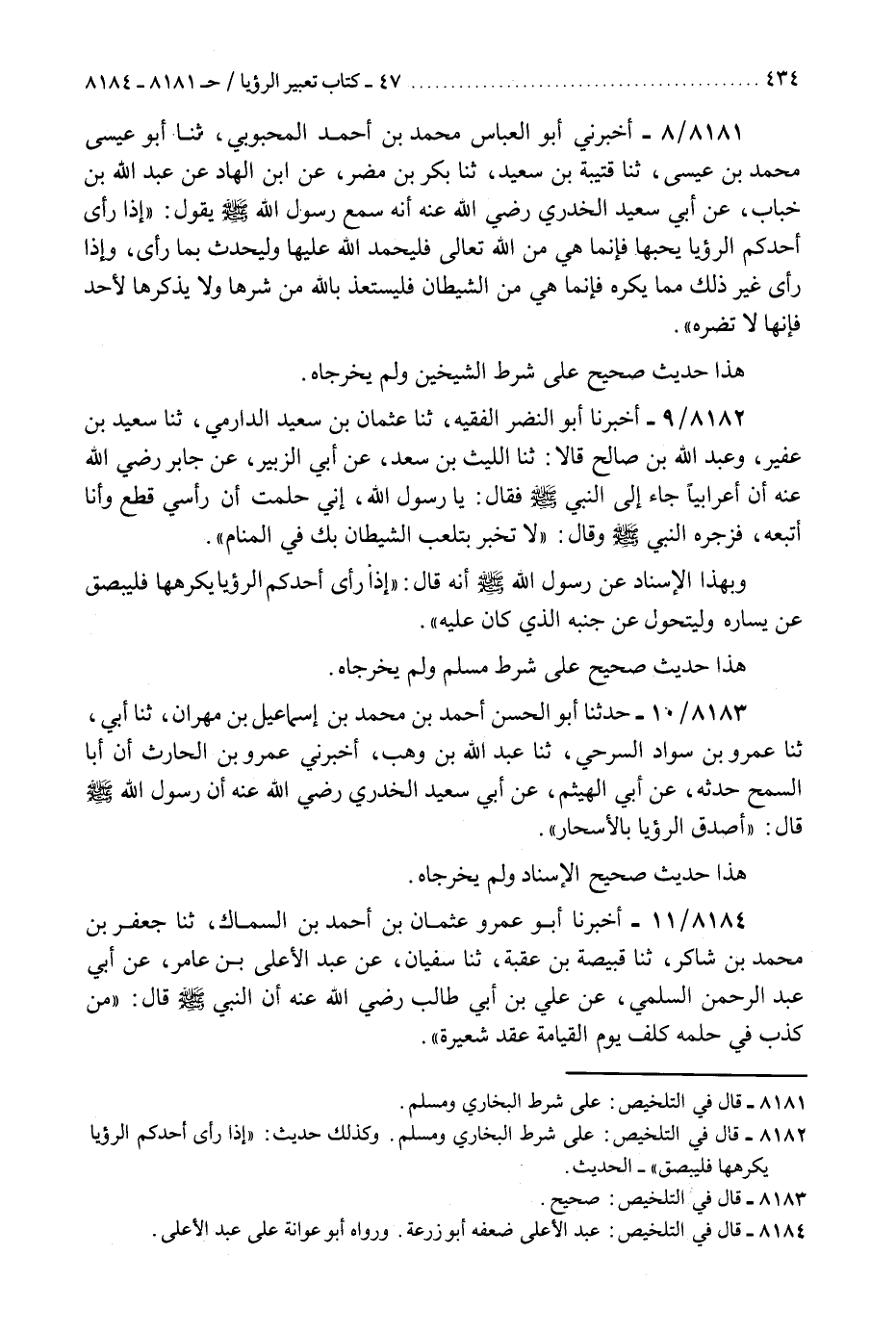 8181 - أَخْبَرَنِي أَبُو الْعَبَّاسِ مُحَمَّدُ بْنُ أَحْمَدَ الْمَحْبُوبِيُّ، ثَنَا أَبُو عِيسَى مُحَمَّدُ بْنُ عِيسَى، ثَنَا قُتَيْبَةُ بْنُ سَعِيدٍ، ثَنَا بَكْرُ بْنُ مُضَرٍ، عَنِ ابْنِ الْهَادِ، عَنْ عَبْدِ اللَّهِ بْنِ خَبَّابٍ، عَنْ أَبِي سَعِيدٍ الْخُدْرِيِّ رَضِيَ اللَّهُ عَنْهُ أَنَّهُ سَمِعَ رَسُولَ اللَّهِ صَلَّى اللهُ عَلَيْهِ وَسَلَّمَ يَقُولُ: §«إِذَا رَأَى أَحَدُكُمُ الرُّؤْيَا يُحِبُّهَا فَإِنَّمَا هِيَ مِنَ اللَّهِ تَعَالَى فَلْيَحْمَدِ اللَّهَ عَلَيْهَا وَلْيُحَدِّثْ بِمَا رَأَى، وَإِذَا رَأَى غَيْرَ ذَلِكَ مِمَّا يَكْرَهُ فَإِنَّمَا هِيَ مِنَ الشَّيْطَانِ فَلْيَسْتَعِذْ بِاللَّهِ مِنْ شَرِّهَا وَلَا يَذْكُرْهَا لِأَحَدٍ فَإِنَّهَا لَا تَضُرُّهُ» هَذَا حَدِيثٌ صَحِيحٌ عَلَى شَرْطِ الشَّيْخَيْنِ وَلَمْ يُخَرِّجَاهُ "K8181 - على شرط البخاري ومسلم