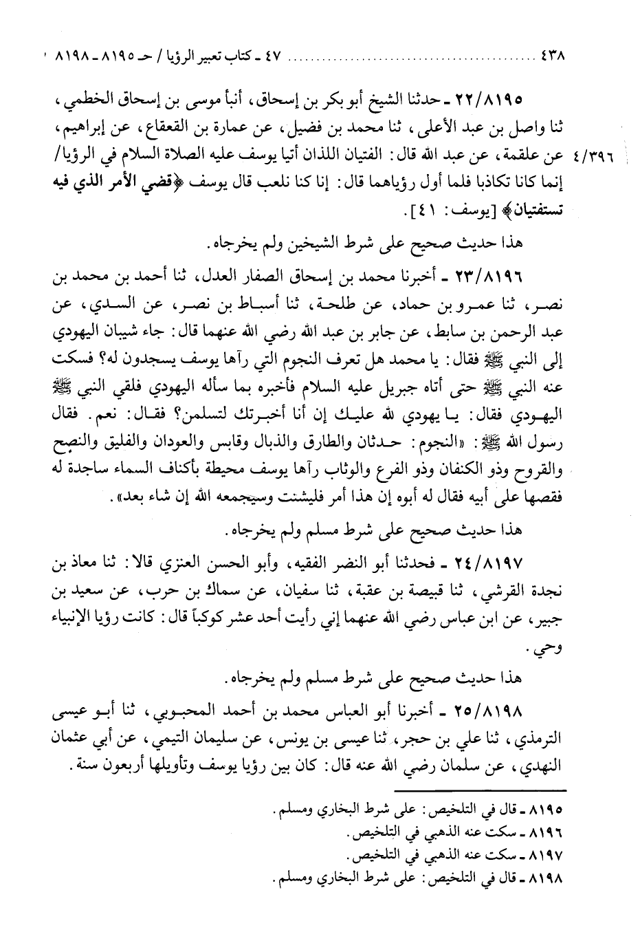 8195 - حَدَّثَنَا الشَّيْخُ أَبُو بَكْرِ بْنُ إِسْحَاقَ، أَنْبَأَ مُوسَى بْنُ إِسْحَاقَ الْخَطْمِيُّ، ثَنَا وَاصِلُ بْنُ عَبْدِ الْأَعْلَى، ثَنَا مُحَمَّدُ بْنُ فُضَيْلٍ، عَنْ عُمَارَةَ بْنِ الْقَعْقَاعِ، عَنْ إِبْرَاهِيمَ، عَنْ عَلْقَمَةَ، عَنْ عَبْدِ اللَّهِ قَالَ: §" الْفَتَيَانِ اللَّذَانِ أَتَيَا يُوسُفَ عَلَيْهِ الصَّلَاةُ وَالسَّلَامُ فِي الرُّؤْيَا إِنَّمَا كَانَا تَكَاذَبَا فَلَمَّا أَوَّلَ رُؤْيَاهُمَا قَالَ: إِنَّا كُنَّا نَلْعَبُ، قَالَ يُوسُفُ: قُضِيَ الْأَمْرُ الَّذِي فِيهِ تَسْتَفْتِيَانِ «هَذَا حَدِيثٌ صَحِيحٌ عَلَى شَرْطِ الشَّيْخَيْنِ وَلَمْ يُخَرِّجَاهُ» K8195 - على شرط البخاري ومسلم