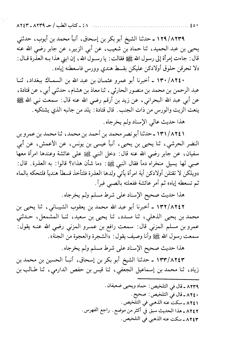 8241 - حَدَّثَنَا أَبُو نَصْرٍ مُحَمَّدُ بْنُ أَحْمَدَ بْنِ مُحَمَّدٍ، ثَنَا مُحَمَّدُ بْنُ عَمْرِو بْنِ النَّضْرِ الْحَرَشِيُّ، ثَنَا يَحْيَى بْنُ يَحْيَى، أَنْبَأَ عِيسَى بْنُ يُونُسَ، عَنِ الْأَعْمَشِ، عَنْ أَبِي سُفْيَانَ، عَنْ جَابِرٍ رَضِيَ اللَّهُ عَنْهُ، قَالَ: دَخَلَ النَّبِيُّ صَلَّى اللهُ عَلَيْهِ وَسَلَّمَ عَلَى عَائِشَةَ، وَعِنْدَهَا امْرَأَةٌ مَعَهَا صَبِيٌّ لَهَا يَسِيلُ مَنْخِرَاهُ دَمًا، فَقَالَ النَّبِيُّ صَلَّى اللهُ عَلَيْهِ وَسَلَّمَ: «مَا شَأْنُ هَذَا؟» قَالُوا: بِهِ الْعُذْرَةُ، قَالَ: «وَيْلَكُنَّ لَا تَقْتُلْنَ أَوْلَادَكُنَّ، §أَيَّةُ امْرَأَةٍ يَأْتِي وَلَدَهَا الْعُذْرَةُ فَلْتَأْخُذْ قِسْطًا هِنْدِيًّا فَلْتَحُكَّهُ بِالْمَاءِ ثُمَّ تُسْعِطْهُ إِيَّاهُ» ثُمَّ أَمَرَ عَائِشَةَ فَفَعَلَتْهُ بِالصَّبِيِّ فَبَرَأَ «هَذَا حَدِيثٌ صَحِيحُ الْإِسْنَادِ عَلَى شَرْطِ مُسْلِمٍ، وَلَمْ يُخْرِجَاهُ» K8241 - سكت عنه الذهبي في التلخيص