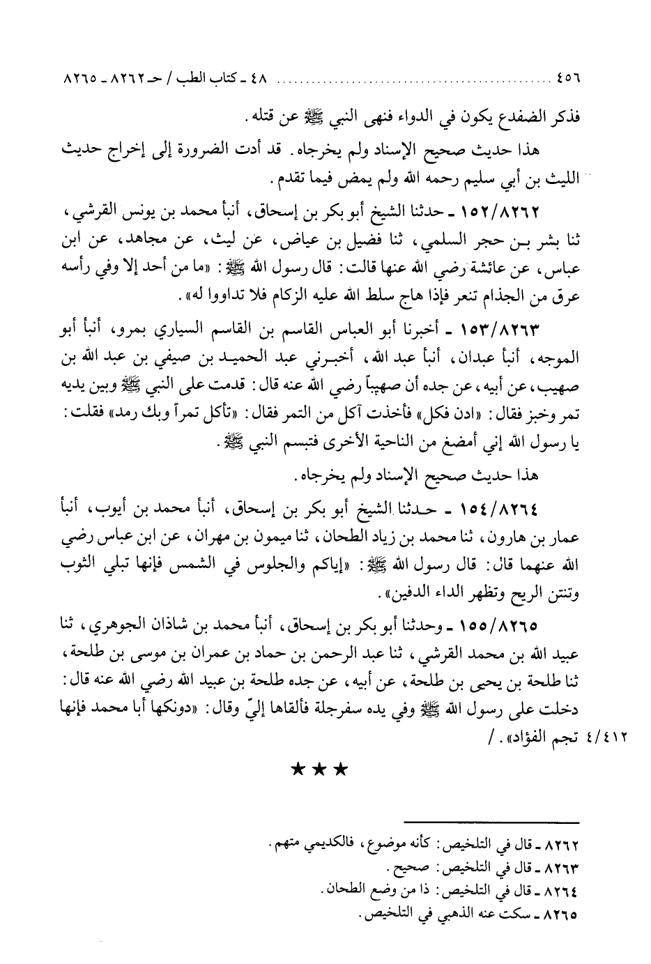 8265 - وَحَدَّثَنَا أَبُو بَكْرِ بْنُ إِسْحَاقَ، أَنْبَأَ مُحَمَّدُ بْنُ شَاذَانَ الْجَوْهَرِيُّ، ثَنَا عُبَيْدُ اللَّهِ بْنُ مُحَمَّدٍ الْقُرَشِيُّ، ثَنَا عَبْدُ الرَّحْمَنِ بْنُ حَمَّادِ بْنِ عِمْرَانَ بْنِ مُوسَى بْنِ طَلْحَةَ، ثَنَا طَلْحَةُ بْنُ يَحْيَى بْنِ طَلْحَةَ، عَنْ أَبِيهِ، عَنْ جَدِّهِ طَلْحَةَ بْنِ عُبَيْدِ اللَّهِ رَضِيَ اللَّهُ عَنْهُ، قَالَ: دَخَلْتُ عَلَى رَسُولِ اللَّهِ صَلَّى اللهُ عَلَيْهِ وَسَلَّمَ وَفِي يَدِهِ سَفَرْجَلَةٌ فَأَلْقَاهَا إِلَيَّ، وَقَالَ: §«دُونَكَهَا أَبَا مُحَمَّدٍ فَإِنَّهَا تُجِمُّ الْفُؤَادَ» K8265 - سكت عنه الذهبي في التلخيص