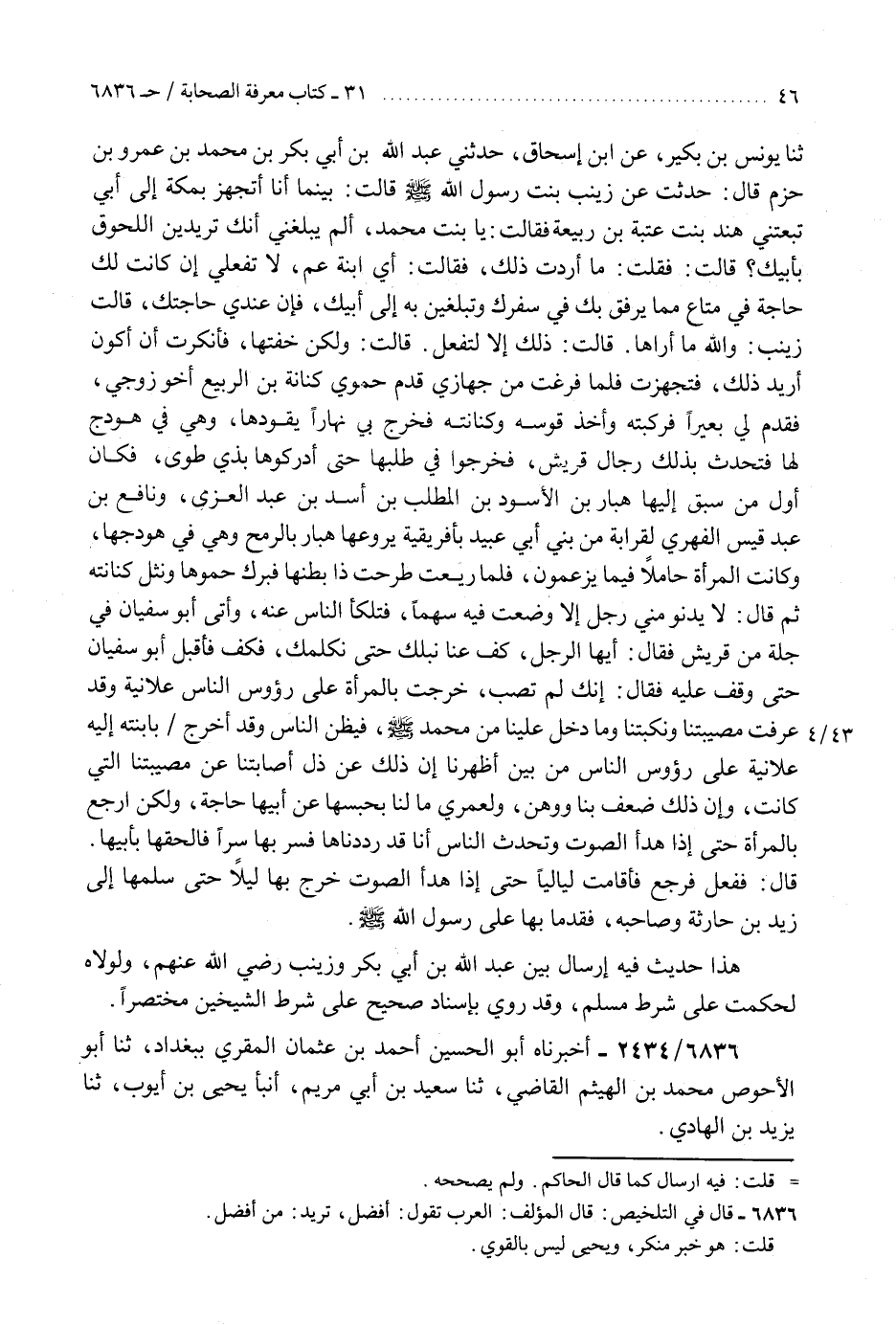6836 - أَخْبَرَنَاهُ أَبُو الْحُسَيْنِ أَحْمَدُ بْنُ عُثْمَانَ الْمُقْرِئُ بِبَغْدَادَ، ثَنَا أَبُو الْأَحْوَصِ مُحَمَّدُ بْنُ الْهَيْثَمِ الْقَاضِي، ثَنَا سَعِيدُ بْنُ أَبِي مَرْيَمَ، أنبأ يَحْيَى بْنُ أَيُّوبَ، ثَنَا يَزِيدُ بْنُ الْهَادِي، وَحَدَّثَنِي عُمَرُ بْنُ عَبْدِ اللَّهِ بْنِ عُرْوَةَ، عَنْ عُرْوَةَ بْنِ الزُّبَيْرِ، عَنْ عَائِشَةَ، زَوْجِ النَّبِيِّ صَلَّى اللهُ عَلَيْهِ وَسَلَّمَ أَنَّ رَسُولَ اللَّهِ صَلَّى اللهُ عَلَيْهِ وَسَلَّمَ لَمَّا قَدِمَ الْمَدِينَةَ خَرَجَتِ ابْنَتُهُ زَيْنَبُ مِنْ مَكَّةَ مَعَ كِنَانَةَ أَوِ ابْنِ كِنَانَةَ، فَخَرَجُوا فِي أَثَرِهَا فَأَدْرَكَهَا هَبَّارُ بْنُ الْأَسْوَدِ، فَلَمْ يَزَلْ يَطْعَنُ بَعِيرَهَا بِرُمْحِهِ حَتَّى صَرَعَهَا وَأَلْقَتْ مَا فِي بَطْنِهَا وَأَهْرَاقَتْ دَمًا، فَحُمِلَتْ فَاشْتَجَرَ فِيهَا بَنُو هَاشِمٍ وَبَنُو أُمَيَّةَ فَقَالَ بَنُو أُمَيَّةَ: نَحْنُ أَحَقُّ بِهَا، وَكَانَتْ تَحْتَ ابْنِ عَمِّهِمْ أَبِي الْعَاصِ فَصَارَتْ عِنْدَ هِنْدِ بِنْتِ عُتْبَةَ بْنِ رَبِيعَةَ وَكَانَتْ تَقُولُ لَهَا هِنْدٌ: هَذَا بِسَبَبِ أَبِيكِ فَقَالَ رَسُولُ اللَّهِ صَلَّى اللهُ عَلَيْهِ وَسَلَّمَ لِزَيْدِ بْنِ حَارِثَةَ: «§أَلَا تَنْطَلِقُ فَتَجِيئُنِي بِزَيْنَبَ؟» قَالَ: بَلَى يَا رَسُولَ اللَّهِ قَالَ: «فَخُذْ خَاتَمِي فَأَعْطِهَا إِيَّاهُ» ، فَانْطَلَقَ زَيْدٌ وَتَرَكَ بَعِيرَهُ، فَلَمْ يَزَلْ يَتَلَطَّفُ حَتَّى لَقِيَ رَاعِيًا فَقَالَ: لِمَنْ تَرْعَى؟ قَالَ: لِأَبِي الْعَاصِ قَالَ: فَلِمَنْ هَذِهِ الْغَنَمُ؟ قَالَ: لِزَيْنَبَ بِنْتِ مُحَمَّدٍ فَسَارَ مَعَهُ شَيْئًا، ثُمَّ قَالَ لَهُ: هَلْ لَكَ أَنْ أُعْطِيكَ شَيْئًا تُعْطِيهَا إِيَّاهُ وَلَا تَذْكُرُهُ لِأَحَدٍ، قَالَ: نَعَمْ، فَأَعْطَاهُ الْخَاتَمَ فَانْطَلَقَ الرَّاعِي فَأَدْخَلَ غَنَمَهُ وَأَعْطَاهَا الْخَاتَمَ فَعَرَفَتْهُ فَقَالَتْ: مَنْ أَعْطَاكَ هَذَا؟ قَالَ: رَجُلٌ، قَالَتْ: وَأَيْنَ تَرَكْتَهُ؟ قَالَ: بِمَكَانِ كَذَا وَكَذَا قَالَ: فَسَكَتَتْ حَتَّى إِذَا جَاءَ اللَّيْلُ خَرَجَتْ إِلَيْهِ فَلَمَّا جَاءَتْهُ قَالَ لَهَا: ارْكَبِي، قَالَتْ: لَا وَلَكِنِ ارْكَبْ أَنْتَ بَيْنَ يَدِي، فَرَكِبَ وَرَكِبَتْ وَرَاءَهُ حَتَّى أَتَتْ فَكَانَ رَسُولُ اللَّهِ صَلَّى اللهُ عَلَيْهِ وَسَلَّمَ يَقُولُ: «هِيَ أَفْضَلُ بَنَاتِي أُصِيبَتْ فِي» فَبَلَغَ ذَلِكَ عَلِيَّ بْنَ الْحُسَيْنِ، فَانْطَلَقَ إِلَى عُرْوَةَ فَقَالَ: مَا حَدِيثٌ بَلَغَنِي عَنْكَ تُحَدِّثُ بِهِ تَنْتَقِصُ بِهِ حَقَّ فَاطِمَةَ قَالَ عُرْوَةُ: «وَاللَّهِ إِنِّي لَا أُحِبُّ أَنَّ لِي مَا بَيْنَ الْمَشْرِقِ وَالْمَغْرِبِ، وَإِنِّي أَنْتَقِصُ فَاطِمَةَ رَضِيَ اللَّهُ عَنْهَا حَقًّا هُوَ لَهَا وَأَمَّا بَعْدُ فَإِنَّ لَكَ أَنْ لَا أُحَدِّثَ بِهِ أَبَدًا» هَذَا حَدِيثٌ صَحِيحٌ عَلَى شَرْطِ الشَّيْخَيْنِ وَلَمْ يُخَرِّجَاهُ "