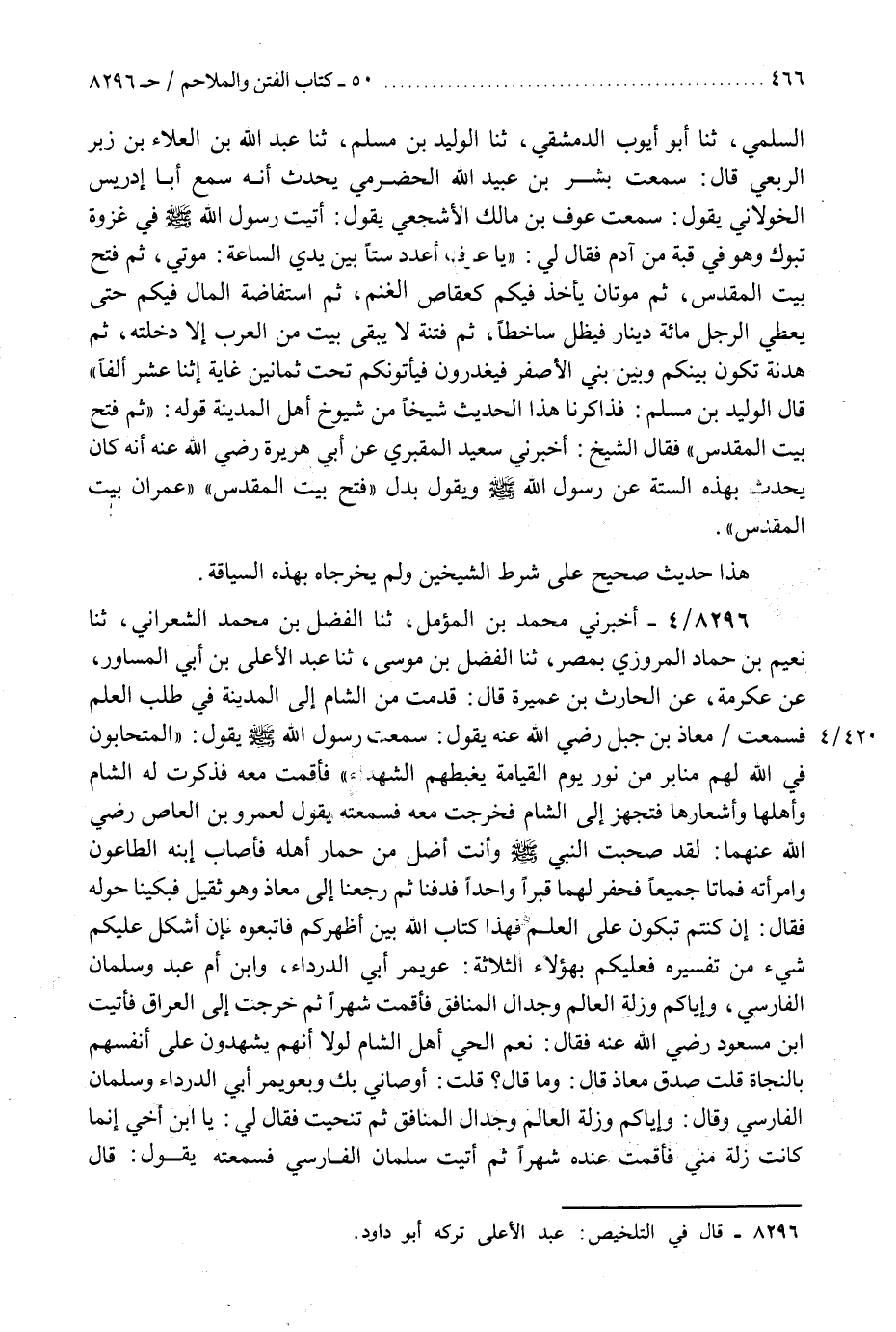 8296 - أَخْبَرَنِي مُحَمَّدُ بْنُ الْمُؤَمَّلِ، ثَنَا الْفَضْلُ بْنُ مُحَمَّدٍ الشَّعْرَانِيُّ، ثَنَا نُعَيْمُ بْنُ حَمَّادٍ الْمَرْوَزِيُّ، بِمِصْرَ، ثَنَا الْفَضْلُ بْنُ مُوسَى، ثَنَا عَبْدُ الْأَعْلَى بْنُ أَبِي الْمُسَاوِرِ، عَنْ عِكْرِمَةَ، عَنِ الْحَارِثِ بْنِ عُمَيْرَةَ، قَالَ: قَدِمْتُ مِنَ الشَّامِ إِلَى الْمَدِينَةِ فِي طَلَبِ الْعِلْمِ، فَسَمِعْتُ مُعَاذَ بْنَ جَبَلٍ رَضِيَ اللَّهُ عَنْهُ، يَقُولُ: سَمِعْتُ رَسُولَ اللَّهِ صَلَّى اللهُ عَلَيْهِ وَسَلَّمَ، يَقُولُ: §«الْمُتَحَابُّونَ فِي اللَّهِ لَهُمْ مَنَابِرُ مِنْ نُورٍ يَوْمَ الْقِيَامَةِ يَغْبِطُهُمُ الشُّهَدَاءُ»