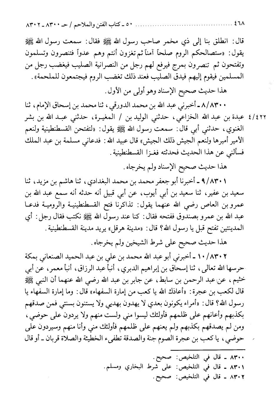 8301 - أَخْبَرَنَا أَبُو جَعْفَرٍ مُحَمَّدُ بْنُ مُحَمَّدٍ الْبَغْدَادِيُّ، ثَنَا هَاشِمُ بْنُ مَرْثَدٍ، ثَنَا سَعِيدُ بْنُ عُفَيْرٍ، ثَنَا سَعِيدُ بْنُ أَبِي أَيُّوبَ، عَنْ أَبِي قَبِيلٍ أَنَّهُ حَدَّثَهُ، أَنَّهُ سَمِعَ عَبْدَ اللَّهِ بْنَ عَمْرِو بْنِ الْعَاصِ رَضِيَ اللَّهُ عَنْهُمَا، يَقُولُ: تَذَاكَرْنَا فَتْحَ الْقُسْطَنْطِينِيَّةِ وَالرُّومِيَّةِ، فَدَعَا عَبْدُ اللَّهِ بْنُ عَمْرٍو بِصُنْدُوقٍ فَفَتَحَهُ، فَقَالَ: كُنَّا عِنْدَ رَسُولِ اللَّهِ صَلَّى اللهُ عَلَيْهِ وَسَلَّمَ نَكْتُبُ، فَقَالَ رَجُلٌ: أَيُّ الْمَدِينَتَيْنِ تُفْتَحُ قَبْلُ يَا رَسُولَ اللَّهِ؟ قَالَ: «§مَدِينَةُ هِرَقْلَ» يُرِيدُ مَدِينَةَ الْقُسْطَنْطِينِيَّةِ، «هَذَا حَدِيثٌ صَحِيحٌ عَلَى شَرْطِ الشَّيْخَيْنِ، وَلَمْ يُخْرِجَاهُ» K8301 - على شرط البخاري ومسلم