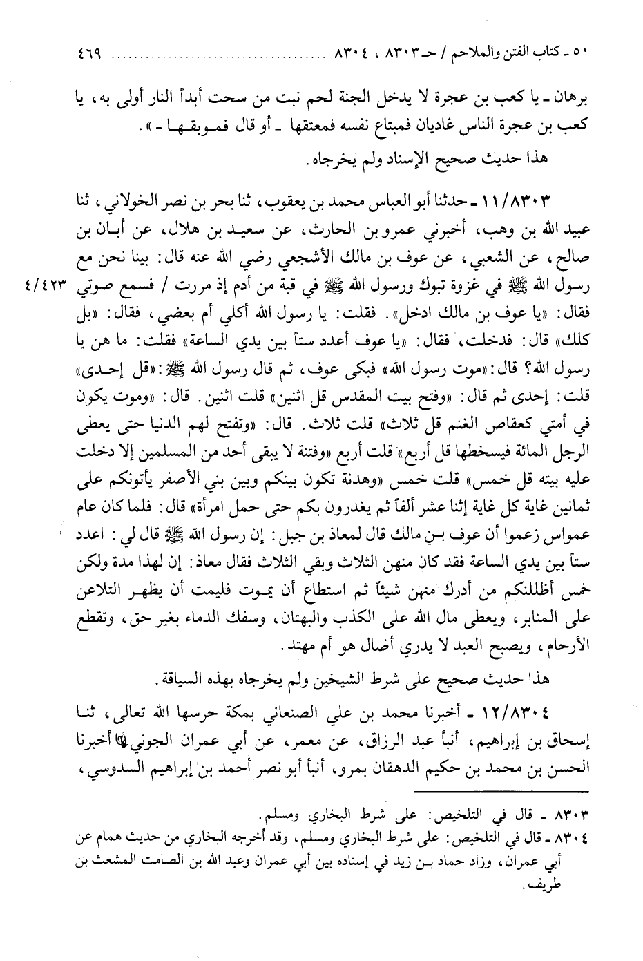8303 - حَدَّثَنَا أَبُو الْعَبَّاسِ مُحَمَّدُ بْنُ يَعْقُوبَ، ثَنَا بَحْرُ بْنُ نَصْرٍ الْخَوْلَانِيُّ، ثَنَا عُبَيْدُ اللَّهِ بْنُ وَهْبٍ، أَخْبَرَنِي عَمْرُو بْنُ الْحَارِثِ، عَنْ سَعِيدِ بْنِ هِلَالٍ، عَنْ أَبَانَ بْنِ صَالِحٍ، عَنِ الشَّعْبِيِّ، عَنْ عَوْفِ بْنِ مَالِكٍ الْأَشْجَعِيِّ رَضِيَ اللَّهُ عَنْهُ، قَالَ: بَيْنَا نَحْنُ مَعَ رَسُولِ اللَّهِ صَلَّى اللهُ عَلَيْهِ وَسَلَّمَ فِي غَزْوَةِ تَبُوكَ، وَرَسُولُ اللَّهِ صَلَّى اللهُ عَلَيْهِ وَسَلَّمَ فِي قُبَّةٍ مِنْ أَدَمٍ، إِذْ مَرَرْتُ فَسَمِعَ صَوْتِي، فَقَالَ: «يَا عَوْفُ بْنُ مَالِكٍ، ادْخُلْ» فَقُلْتُ: يَا رَسُولَ اللَّهِ، أَكُلِّي أَمْ بَعْضِي؟ فَقَالَ: «بَلْ كُلُّكَ» قَالَ: فَدَخَلْتُ، فَقَالَ: «يَا عَوْفُ، §اعْدُدْ سِتًّا بَيْنَ يَدَيِ السَّاعَةِ» فَقُلْتُ: مَا هُنَّ يَا رَسُولَ اللَّهِ؟ قَالَ: «مَوْتُ رَسُولِ اللَّهِ» فَبَكَى عَوْفٌ، ثُمَّ قَالَ رَسُولُ اللَّهِ صَلَّى اللهُ عَلَيْهِ وَسَلَّمَ: " قُلْ: إِحْدَى " قُلْتُ: إِحْدَى، ثُمَّ قَالَ: " وَفَتْحُ بَيْتِ الْمَقْدِسِ، قُلِ: اثْنَيْنِ " قُلْتُ: اثْنَيْنِ، قَالَ: " وَمَوْتٌ يَكُونُ فِي أُمَّتِي كَعُقَاصِ الْغَنَمِ، قُلْ: ثَلَاثٌ " قُلْتُ: ثَلَاثٌ، قَالَ: " وَتُفْتَحُ لَهُمُ الدُّنْيَا حَتَّى يُعْطَى الرَّجُلُ الْمِائَةَ فَيَسْخَطَهَا، قُلْ: أَرْبَعٌ "، قُلْتُ: أَرْبَعٌ، " وَفِتْنَةٌ لَا يَبْقَى أَحَدٌ مِنَ الْمُسْلِمِينَ إِلَّا دَخَلَتْ عَلَيْهِ بَيْتَهُ، قُلْ: خَمْسٌ " قُلْتُ: خَمْسٌ، «وَهُدْنَةٌ تَكُونُ بَيْنَكُمْ وَبَيْنَ بَنِي الْأَصْفَرِ يَأْتُونَكُمْ عَلَى ثَمَانِينَ غَايَةً، كُلُّ غَايَةٍ اثْنَا عَشَرَ أَلْفًا، ثُمَّ يَغْدِرُونَ بِكُمْ حَتَّى حَمْلِ امْرَأَةٍ» قَالَ: فَلَمَّا كَانَ عَامَ عَمْوَاسَ زَعَمُوا أَنَّ عَوْفَ بْنَ مَالِكٍ قَالَ لِمُعَاذِ بْنِ جَبَلٍ: إِنَّ رَسُولَ اللَّهِ صَلَّى اللهُ عَلَيْهِ وَسَلَّمَ، قَالَ لِي: «اعْدُدْ سِتًّا بَيْنَ يَدَيِ السَّاعَةِ» فَقَدْ كَانَ مِنْهُنَّ الثَّلَاثُ وَبَقِيَ الثَّلَاثُ، فَقَالَ مُعَاذٌ: إِنَّ لِهَذَا مُدَّةً وَلَكِنْ خَمْسٌ أَظْلَلْنَكُمْ مَنْ أَدْرَكَ مِنْهُنَّ شَيْئًا ثُمَّ اسْتَطَاعَ أَنْ يَمُوتَ فَلْيَمُتْ: أَنْ يَظْهَرَ التَّلَاعُنُ عَلَى الْمَنَابِرِ، وَيُعْطَى مَالُ اللَّهِ عَلَى الْكَذِبِ وِالْبُهْتَانِ وَسَفْكِ الدِّمَاءِ بِغَيْرِ حَقٍّ، وَتُقْطَعُ الْأَرْحَامُ، وَيُصْبِحُ الْعَبْدُ لَا يَدْرِي أَضَالٌّ هُوَ أَمْ مُهْتِدٍ " هَذَا حَدِيثٌ صَحِيحٌ عَلَى شَرْطِ الشَّيْخَيْنِ، وَلَمْ يُخْرِجَاهُ بِهَذِهِ السِّيَاقَةِK8303 - على شرط البخاري ومسلم