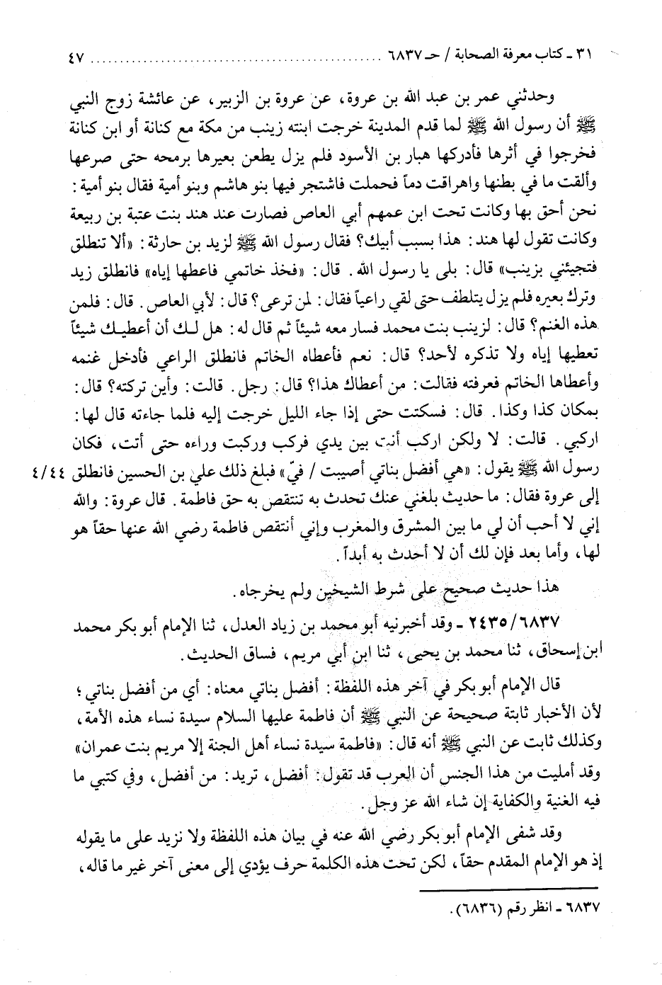 6837 - وَقَدْ أَخْبَرَنِيهِ أَبُو مُحَمَّدِ بْنُ زِيَادٍ الْعَدْلُ، ثَنَا الْإِمَامُ أَبُو بَكْرٍ مُحَمَّدُ بْنُ إِسْحَاقَ، ثَنَا مُحَمَّدُ بْنُ يَحْيَى، ثَنَا ابْنُ أَبِي مَرْيَمَ - فَسَاقَ الْحَدِيثَ، قَالَ الْإِمَامُ أَبُو بَكْرٍ فِي آخِرِ هَذِهِ اللَّفْظَةِ: أَفْضَلُ بَنَاتِي مَعْنَاهُ: أَيْ مِنْ أَفْضَلِ بَنَاتِي، لِأَنَّ الْأَخْبَارَ ثَابِتَةٌ صَحِيحَةٌ عَنِ النَّبِيِّ صَلَّى اللهُ عَلَيْهِ وَسَلَّمَ أَنَّ فَاطِمَةَ عَلَيْهَا السَّلَامُ سَيِّدَةُ نِسَاءِ هَذِهِ الْأُمَّةِ - وَكَذَلِكَ ثَابِتٌ عَنِ النَّبِيِّ صَلَّى اللهُ عَلَيْهِ وَسَلَّمَ، أَنَّهُ قَالَ: §«فَاطِمَةُ سَيِّدَةُ نِسَاءِ أَهْلِ الْجَنَّةِ إِلَّا مَرْيَمَ بِنْتَ عِمْرَانَ» وَقَدْ أُمْلِيتُ مِنْ هَذَا الْجِنْسِ أَنَّ الْعَرَبَ قَدْ تَقُولُ أَفْضَلُ: تُرِيدُ مِنْ أَفْضَلَ، وَفِي كُتُبِي مَا فِيهِ الْغَنِيَّةُ وَالْكِفَايَةُ إِنْ شَاءَ اللَّهُ عَزَّ وَجَلَّ، وَقَدْ شَفَى الْإِمَامُ أَبُو بَكْرٍ رَضِيَ اللَّهُ عَنْهُ فِي بَيَانِ هَذِهِ اللَّفْظَةِ وَلَا نَزِيدُ عَلَى مَا يَقُولُهُ إِذْ هُوَ الْإِمَامُ الْمُقَدَّمُ حَقًّا، لَكِنْ تَحْتَ هَذِهِ الْكَلِمَةِ حَرْفٌ يُؤَدِّي إِلَى مَعْنًى آخَرَ غَيْرِ مَا قَالَهُ وَهُوَ أَنَّ الْعِلْمَ مُحِيطٌ بِأَنَّ زَيْنَبَ أَكْبَرُ مِنْ فَاطِمَةَ رَضِيَ اللَّهُ عَنْهَا سِنًّا وُلِدَتْ قَبْلَهَا وَيُمْكِنُ أَنْ يُقَالَ: إِنَّ رَسُولَ اللَّهِ صَلَّى اللهُ عَلَيْهِ وَسَلَّمَ أَرَادَ بِقَوْلِهِ أَفْضَلُ: أَيْ أَكْبَرُ وَأَقْدَمُ أَوْلَادِي وَاللَّهُ أَعْلَمُ "