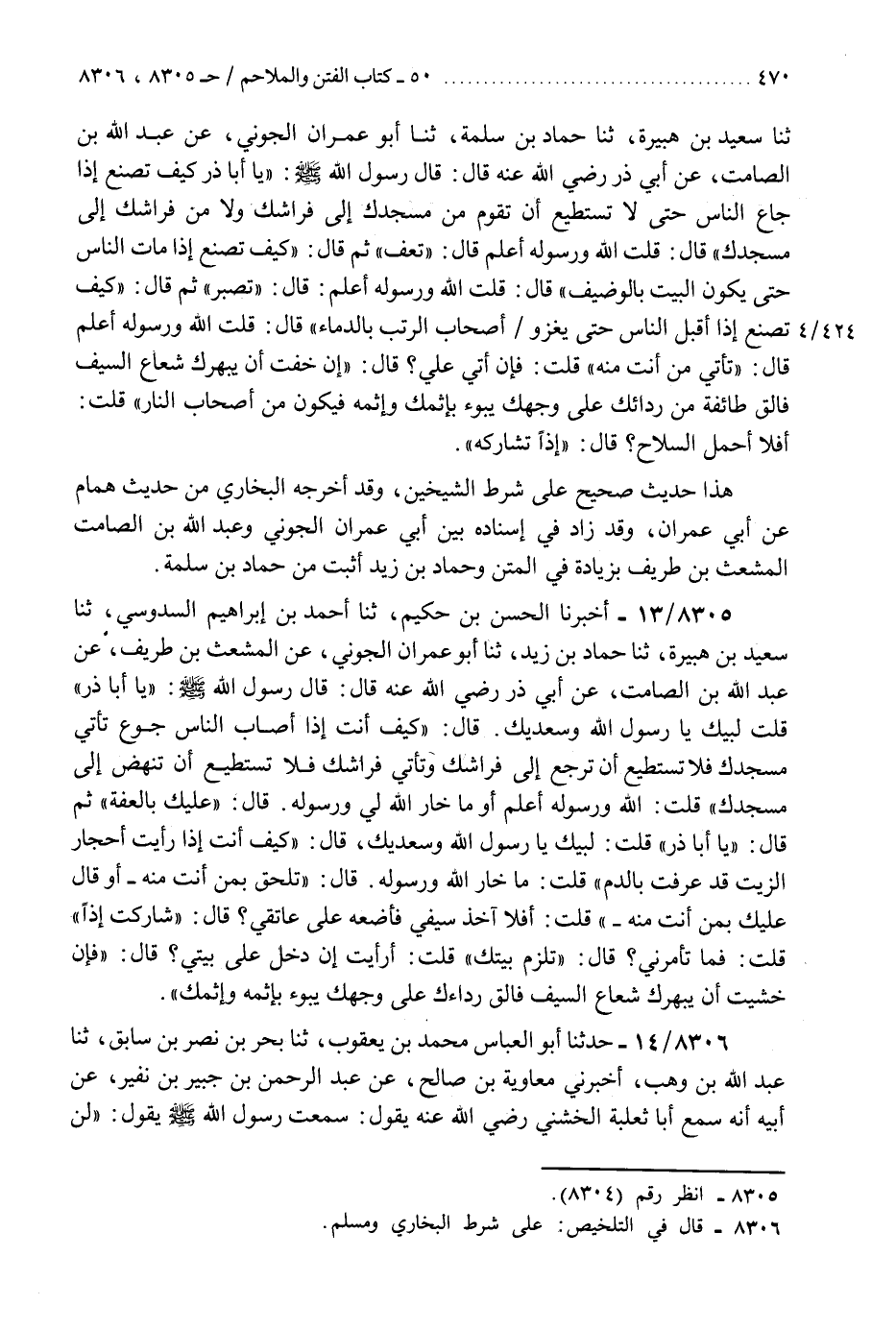 8305 - أَخْبَرَنَا الْحَسَنُ بْنُ حَكِيمٍ، ثَنَا أَحْمَدُ بْنُ إِبْرَاهِيمَ السَّدُوسِيُّ، ثَنَا سَعِيدُ بْنُ هُبَيْرَةَ، ثَنَا حَمَّادُ بْنُ زَيْدٍ، ثَنَا أَبُو عِمْرَانَ الْجَوْنِيُّ، عَنِ الْمُشَعَّثِ بْنِ طَرِيفٍ، عَنْ عَبْدِ اللَّهِ بْنِ الصَّامِتِ، عَنْ أَبِي ذَرٍّ رَضِيَ اللَّهُ عَنْهُ، قَالَ: قَالَ رَسُولُ اللَّهِ صَلَّى اللهُ عَلَيْهِ وَسَلَّمَ: «يَا أَبَا ذَرٍّ» قُلْتُ: لَبَّيْكَ يَا رَسُولَ اللَّهِ وَسَعْدَيْكَ، قَالَ: «§كَيْفَ أَنْتَ إِذَا أَصَابَ النَّاسَ جُوعٌ، تَأْتِي مَسْجِدَكَ فَلَا تَسْتَطِيعُ أَنْ تَرْجِعَ إِلَى فِرَاشِكَ، وَتَأْتِي فِرَاشَكَ فَلَا تَسْتَطِيعُ أَنْ تَنْهَضَ إِلَى مَسْجِدِكَ» قُلْتُ: اللَّهُ وَرَسُولُهُ أَعْلَمُ - أَوْ مَا خَارَ اللَّهُ لِي وَرَسُولُهُ، قَالَ: «عَلَيْكَ بِالْعِفَّةِ» ثُمَّ قَالَ: «يَا أَبَا ذَرٍّ» قُلْتُ: لَبَّيْكَ يَا رَسُولَ اللَّهِ وَسَعْدَيْكَ، قَالَ: «كَيْفَ أَنْتَ إِذَا رَأَيْتَ أَحْجَارَ الزَّيْتِ قَدْ عُرِّفَتْ بِالدَّمِ؟» قُلْتُ: مَا خَارَ اللَّهُ وَرَسُولُهُ، قَالَ: " تَلْحَقُ بِمَنْ أَنْتَ مِنْهُ - أَوْ قَالَ: عَلَيْكَ بِمَنْ أَنْتَ مِنْهُ - " قُلْتُ: أَفَلَا آخُذُ سَيْفِي فَأَضَعُهُ عَلَى عَاتِقِي؟ قَالَ: «شَارَكْتَ إِذًا» قُلْتُ: فَمَا تَأْمُرُنِي؟ قَالَ: «تَلْزَمُ بَيْتَكَ» قُلْتُ: أَرَأَيْتَ إِنْ دَخَلَ عَلَيَّ بَيْتِي؟ قَالَ: «فَإِنْ خَشِيتَ أَنْ يَبْهَرَكَ شُعَاعُ السَّيْفِ فَأَلْقِ رِدَاءَكَ عَلَى وَجْهِكَ يَبُوءُ بِإِثْمِهِ وَإِثْمِكَ»
