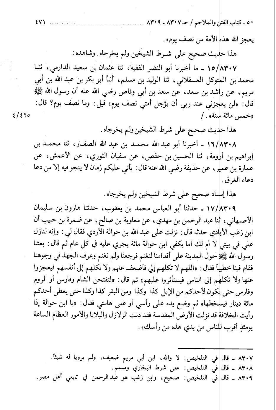 8308 - أَخْبَرَنَا أَبُو عَبْدِ اللَّهِ مُحَمَّدُ بْنُ عَبْدِ اللَّهِ الصَّفَّارُ، ثَنَا مُحَمَّدُ بْنُ إِبْرَاهِيمَ بْنِ أَرُومَةَ، ثَنَا الْحُسَيْنُ بْنُ حَفْصٍ، عَنْ سُفْيَانَ الثَّوْرِيِّ، عَنِ الْأَعْمَشِ، عَنْ عُمَارَةَ بْنِ عُمَيْرٍ، عَنْ حُذَيْفَةَ رَضِيَ اللَّهُ عَنْهُ، قَالَ: §«يَأْتِي عَلَيْكُمْ زَمَانٌ لَا يَنْجُو فِيهِ إِلَّا مَنْ دَعَا دُعَاءَ الْغَرَقِ» هَذَا إِسْنَادٌ صَحِيحٌ عَلَى شَرْطِ الشَّيْخَيْنِ، وَلَمْ يُخْرِجَاهُ "K8308 - على شرط البخاري ومسلم