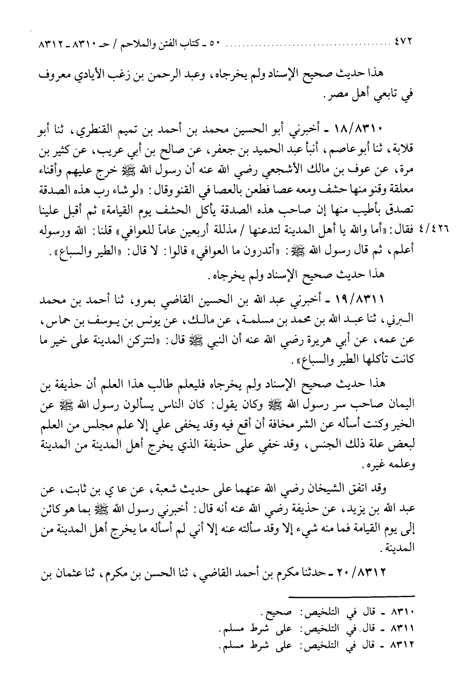 8311 - أَخْبَرَنِي عَبْدُ اللَّهِ بْنُ الْحُسَيْنِ الْقَاضِي بِمَرْوَ، ثَنَا أَحْمَدُ بْنُ مُحَمَّدٍ الْبَرْنِيُّ، ثَنَا عَبْدُ اللَّهِ بْنُ مُحَمَّدِ بْنِ مَسْلَمَةَ، عَنْ مَالِكٍ، عَنْ يُونُسَ بْنِ يُوسُفَ بْنِ حِمَاسٍ، عَنْ عَمِّهِ، عَنْ أَبِي هُرَيْرَةَ رَضِيَ اللَّهُ عَنْهُ، أَنَّ النَّبِيَّ صَلَّى اللهُ عَلَيْهِ وَسَلَّمَ، قَالَ: §«لَتُتْرَكَنَّ الْمَدِينَةُ عَلَى خَيْرِ مَا كَانَتْ تَأْكُلُهَا الطَّيْرُ وَالسِّبَاعُ» هَذَا حَدِيثٌ صَحِيحُ الْإِسْنَادِ، وَلَمْ يُخْرِجَاهُ، فَلْيَعْلَمْ طَالِبُ هَذَا الْعِلْمِ أَنَّ حُذَيْفَةَ بْنَ الْيَمَانِ صَاحِبُ سِرِّ رَسُولِ اللَّهِ صَلَّى اللهُ عَلَيْهِ وَسَلَّمَ، وَكَانَ يَقُولُ: كَانَ النَّاسُ يَسْأَلُونَ رَسُولَ اللَّهِ صَلَّى اللهُ عَلَيْهِ وَسَلَّمَ عَنِ الْخَيْرِ، وَكُنْتُ أَسْأَلُهُ عَنِ الشَّرِّ مَخَافَةَ أَنْ أَقَعَ فِيهِ، وَقَدْ يَخْفَى عَلَيَّ إِلَّا عَلِمَ مَجْلِسٍ مِنَ الْعِلْمِ لِبَعْضِ عِلَّةٍ ذَلِكَ الْجِنْسِ، وَقَدْ خَفِيَ عَلَى حُذَيْفَةَ الَّذِي يُخْرِجُ أَهْلَ الْمَدِينَةِ مِنَ الْمَدِينَةِ وَعَلِمَهُ غَيْرُهُ " وَقَدِ اتَّفَقَ الشَّيْخَانِ رَضِيَ اللَّهُ عَنْهُمَا عَلَى حَدِيثِ شُعْبَةَ، عَنْ عَدِيِّ بْنِ ثَابِتٍ، عَنْ عَبْدِ اللَّهِ بْنِ يَزِيدَ، عَنْ حُذَيْفَةَ رَضِيَ اللَّهُ عَنْهُ أَنَّهُ قَالَ: أَخْبَرَنِي رَسُولُ اللَّهِ صَلَّى اللهُ عَلَيْهِ وَسَلَّمَ بِمَا هُوَ كَائِنٌ إِلَى يَوْمِ الْقِيَامَةِ فَمَا مِنْهُ شَيْءٌ إِلَّا وَقَدْ سَأَلْتُهُ عَنْهُ، إِلَّا أَنِّي لَمْ أَسْأَلْهُ مَا يُخْرِجُ أهْلَ الْمَدِينَةِ مِنَ الْمَدِينَةِ "K8311 - على شرط مسلم