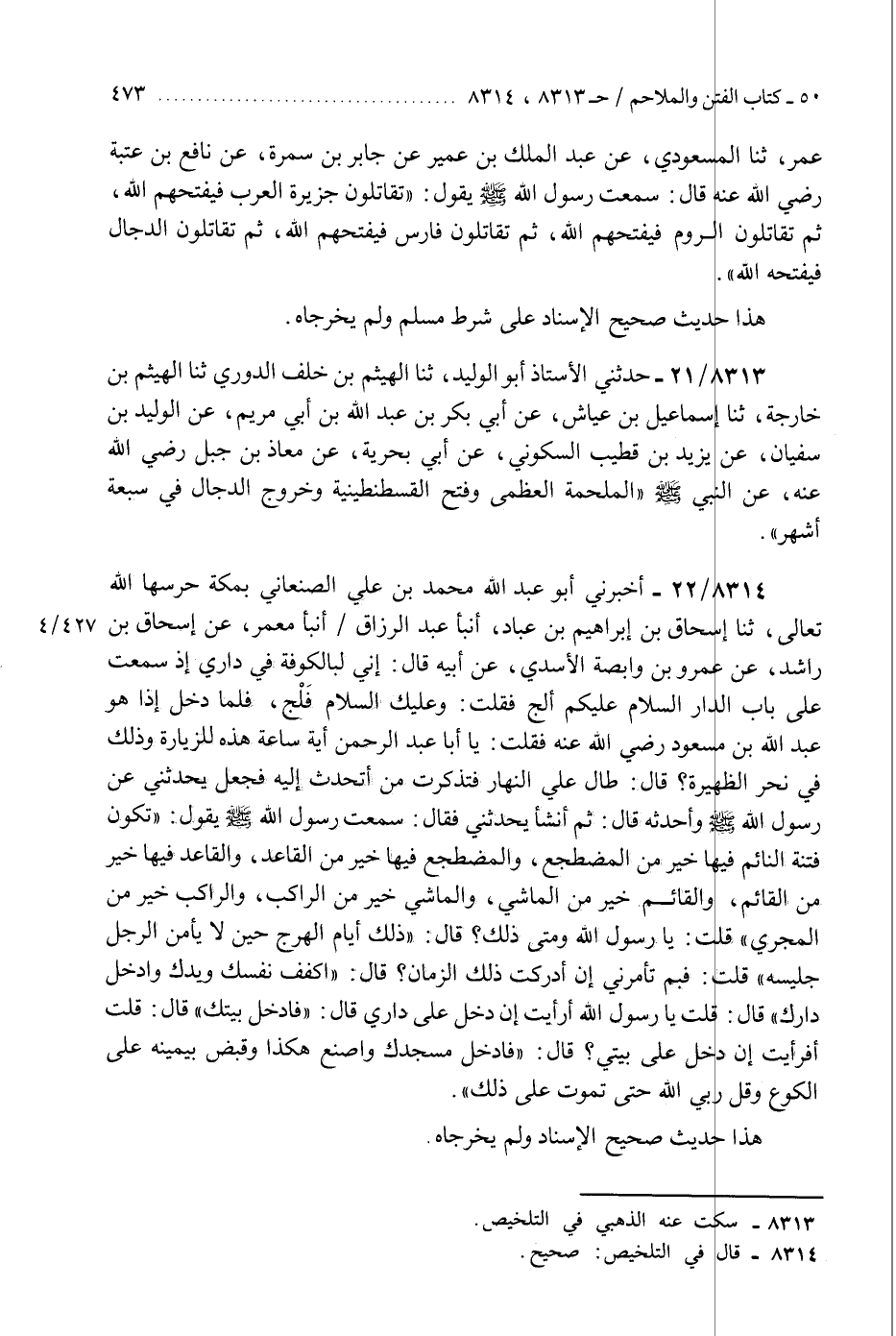 8313 - حَدَّثَنِي الْأُسْتَاذُ أَبُو الْوَلِيدِ، ثَنَا الْهَيْثَمُ بْنُ خَلَفٍ الدُّورِيُّ، ثَنَا الْهَيْثَمُ بْنُ خَارِجَةَ، ثَنَا إِسْمَاعِيلُ بْنُ عَيَّاشٍ، عَنْ أَبِي بَكْرِ بْنِ عَبْدِ اللَّهِ بْنِ أَبِي مَرْيَمَ، عَنِ الْوَلِيدِ بْنِ سُفْيَانَ، عَنْ يَزِيدَ بْنِ قُطَيْبٍ السَّكُونِيِّ، عَنْ أَبِي بَحْرِيَّةَ، عَنْ مُعَاذِ بْنِ جَبَلٍ رَضِيَ اللَّهُ عَنْهُ، عَنِ النَّبِيِّ صَلَّى اللهُ عَلَيْهِ وَسَلَّمَ: «§الْمَلْحَمَةُ الْعُظْمَى، وَفَتْحُ الْقُسْطَنْطِينِيَّةِ، وَخُرُوجُ الدَّجَّالِ فِي سَبْعَةِ أَشْهُرٍ» K8313 - سكت عنه الذهبي في التلخيص