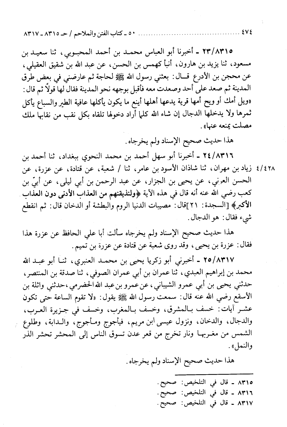 8317 - أَخْبَرَنِي أَبُو زَكَرِيَّا يَحْيَى بْنُ مُحَمَّدٍ الْعَنْبَرِيُّ، ثَنَا أَبُو عَبْدِ اللَّهِ مُحَمَّدُ بْنُ إِبْرَاهِيمَ الْعَبْدِيُّ، ثَنَا عِمْرَانُ بْنُ أَبِي عِمْرَانَ الصُّوفِيُّ، ثَنَا صَدَقَةُ بْنُ الْمُنْتَصِرِ، حَدَّثَنِي يَحْيَى بْنُ أَبِي عَمْرٍو السَّيْبَانِيُّ، عَنْ عَمْرِو بْنِ عَبْدِ اللَّهِ الْحَضْرَمِيِّ، حَدَّثَنِي وَاثِلَةُ بْنُ الْأَسْقَعِ رَضِيَ اللَّهُ عَنْهُ، قَالَ: سَمِعْتُ رَسُولَ اللَّهِ صَلَّى اللهُ عَلَيْهِ وَسَلَّمَ، يَقُولُ: " §لَا تَقُومُ السَّاعَةُ حَتَّى تَكُونَ عَشْرُ آيَاتٍ: خَسْفٌ بِالْمَشْرِقِ، وَخَسْفٌ بِالْمَغْرِبِ، وَخَسْفٌ فِي جَزِيرَةِ الْعَرَبِ، وَالدَّجَّالُ، وَالدُّخَانُ، وَنُزُولُ عِيسَى ابْنِ مَرْيَمَ، فَيَأْجُوجَ وَمَأْجُوجَ، وَالدَّابَّةُ، وَطُلُوعُ الشَّمْسِ مِنْ مَغْرِبِهَا، وَنَارٌ تَخْرُجُ مِنْ قَعْرِ عَدْنَ تَسُوقُ النَّاسَ إِلَى الْمَحْشَرِ، تَحْشُرُ الذَّرَّ وَالنَّمْلَ «هَذَا حَدِيثٌ صَحِيحُ الْإِسْنَادِ، وَلَمْ يُخْرِجَاهُ» K8317 - صحيح
