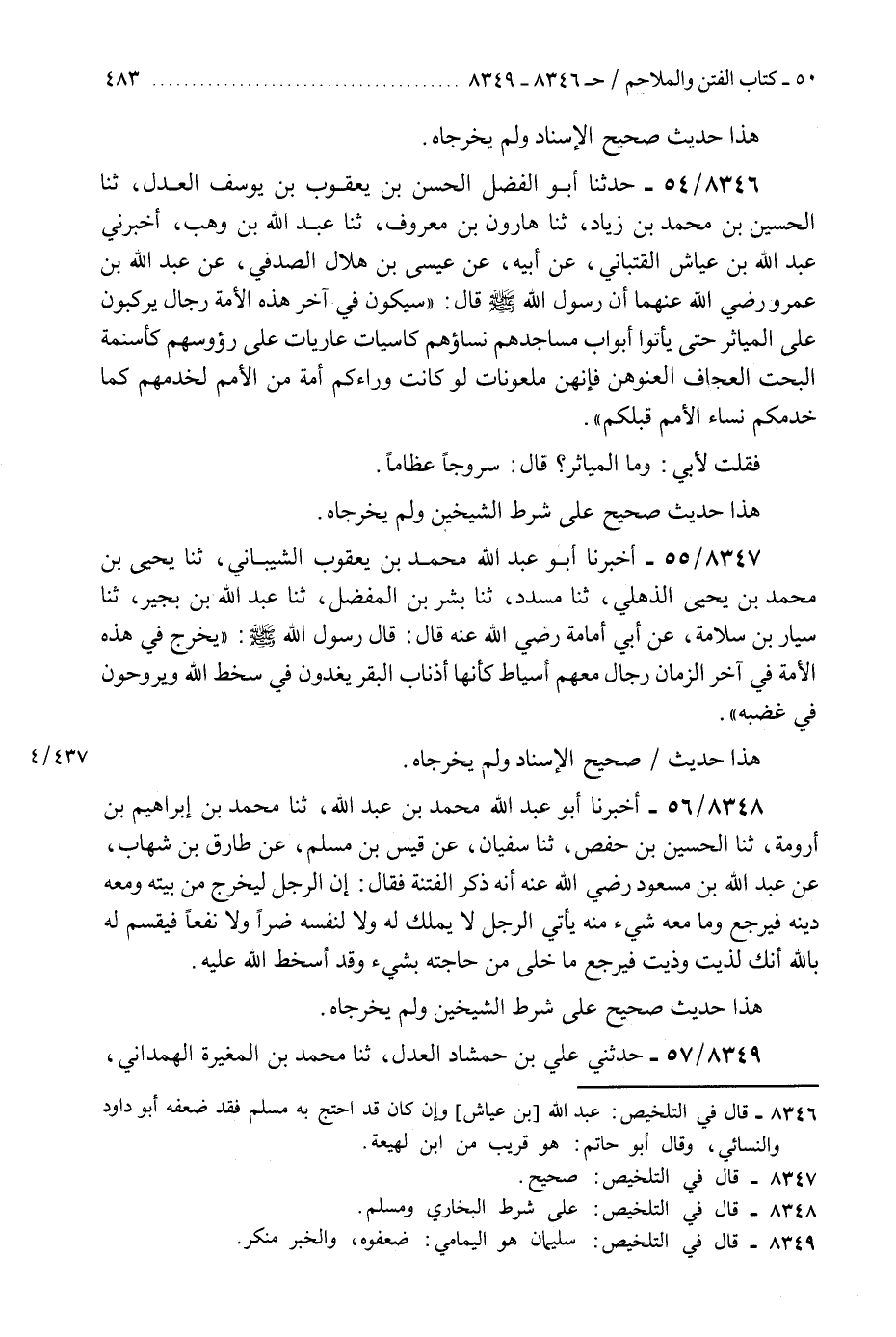 8348 - أَخْبَرَنَا أَبُو عَبْدِ اللَّهِ مُحَمَّدُ بْنُ عَبْدِ اللَّهِ، ثَنَا مُحَمَّدُ بْنُ إِبْرَاهِيمَ بْنِ أَرُومَةَ، ثَنَا الْحُسَيْنُ بْنُ حَفْصٍ، ثَنَا سُفْيَانُ، عَنْ قَيْسِ بْنِ مُسْلِمٍ، عَنْ طَارِقِ بْنِ شِهَابٍ، عَنْ عَبْدِ اللَّهِ بْنِ مَسْعُودٍ رَضِيَ اللَّهُ عَنْهُ، أَنَّهُ ذَكَرَ الْفِتْنَةَ، فَقَالَ: «إِنَّ §الرَّجُلَ لِيَخْرُجُ مِنْ بَيْتِهِ وَمَعَهُ دِينُهُ فَيَرْجِعُ وَمَا مَعَهُ شَيْءٌ مِنْهُ يَأْتِي الرَّجُلَ لَا يَمْلِكُ لَهُ وَلَا لِنَفْسِهِ ضَرًّا وَلَا نَفْعًا، فَيُقْسِمُ لَهُ بِاللَّهِ إِنَّكَ لَذَيْتَ وَذَيْتَ فَيَرْجِعُ مَا خَلَّى مِنْ حَاجَتِهِ بِشَيْءٍ، وَقَدْ أَسْخَطَ اللَّهَ عَلَيْهِ» هَذَا حَدِيثٌ صَحِيحٌ عَلَى شَرْطِ الشَّيْخَيْنِ، وَلَمْ يُخْرِجَاهُ "K8348 - على شرط البخاري ومسلم