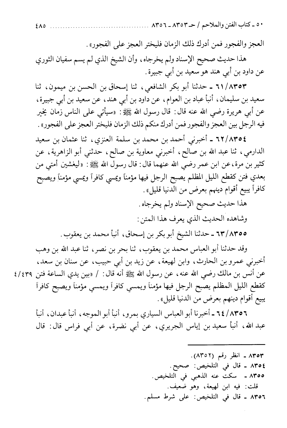 8355 - حَدَّثَنَا الشَّيْخُ أَبُو بَكْرِ بْنُ إِسْحَاقَ، أَنْبَأَ مُحَمَّدُ بْنُ يَعْقُوبَ، وَقَدْ حَدَّثَنَا أَبُو الْعَبَّاسِ مُحَمَّدُ بْنُ يَعْقُوبَ، ثَنَا بَحْرُ بْنُ نَصْرٍ، ثَنَا عَبْدُ اللَّهِ بْنُ وَهْبٍ، أَخْبَرَنِي عَمْرُو بْنُ الْحَارِثِ، وَابْنُ لَهِيعَةَ، عَنْ زَيْدِ بْنِ أَبِي حَبِيبٍ، عَنْ سِنَانِ بْنِ سَعْدٍ، عَنْ أَنَسِ بْنِ مَالِكٍ رَضِيَ اللَّهُ عَنْهُ، عَنْ رَسُولِ اللَّهِ صَلَّى اللهُ عَلَيْهِ وَسَلَّمَ أَنَّهُ قَالَ: «§بَيْنَ يَدَيِ السَّاعَةِ فِتَنٌ كَقِطَعِ اللَّيْلِ الْمُظْلِمِ، يُصْبِحُ الرَّجُلُ فِيهَا مُؤْمِنًا وَيُمْسِي كَافِرًا، وَيُمْسِي مُؤْمِنًا وَيُصْبِحُ كَافِرًا، يَبِيعُ أَقْوَامٌ دِينَهُمْ بِعَرَضٍ مِنَ الدُّنْيَا قَلِيلٍ» K8355 - سكت عنه الذهبي في التلخيص