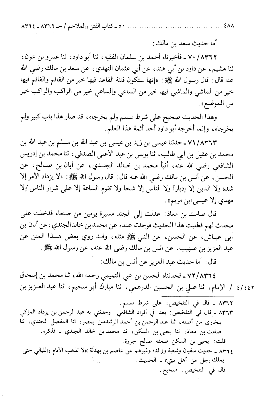 8362 - فَأَخْبَرْنَاهُ أَحْمَدُ بْنُ سَلْمَانَ الْفَقِيهُ، ثَنَا أَبُو دَاوُدَ، ثَنَا عَمْرُو بْنُ عَوْنٍ، ثَنَا هُشَيْمٌ، عَنْ دَاوُدَ بْنِ أَبِي هِنْدٍ، عَنْ أَبِي عُثْمَانَ النَّهْدِيِّ، عَنْ سَعْدِ بْنِ مَالِكٍ رَضِيَ اللَّهُ عَنْهُ، قَالَ: قَالَ رَسُولُ اللَّهِ صَلَّى اللهُ عَلَيْهِ وَسَلَّمَ: «إِنَّهَا §سَتَكُونُ فِتْنَةٌ الْقَاعِدُ فِيهَا خَيْرٌ مِنَ الْقَائِمِ، وَالْقَائِمُ فِيهَا خَيْرٌ مِنَ الْمَاشِي، وَالْمَاشِي فِيهَا خَيْرٌ مِنَ السَّاعِي، وَالسَّاعِي خَيْرٌ مِنَ الرَّاكِبِ، وَالرَّاكِبُ خَيْرٌ مِنَ الْمُوضِعِ» وَهَذَا الْحَدِيثُ صَحِيحٌ عَلَى شَرْطِ مُسْلِمٍ، وَلَمْ يُخْرِجَاهُ، قَدْ صَارَ هَذَا بَابٌ كَبِيرٌ وَلَمْ يُخْرِجَاهُ، وَإِنَّمَا أَخْرَجَهُ أَبُو دَاوُدَ أَحَدُ أَئِمَّةِ هَذَا الْعِلْمِ "K8362 - على شرط مسلم