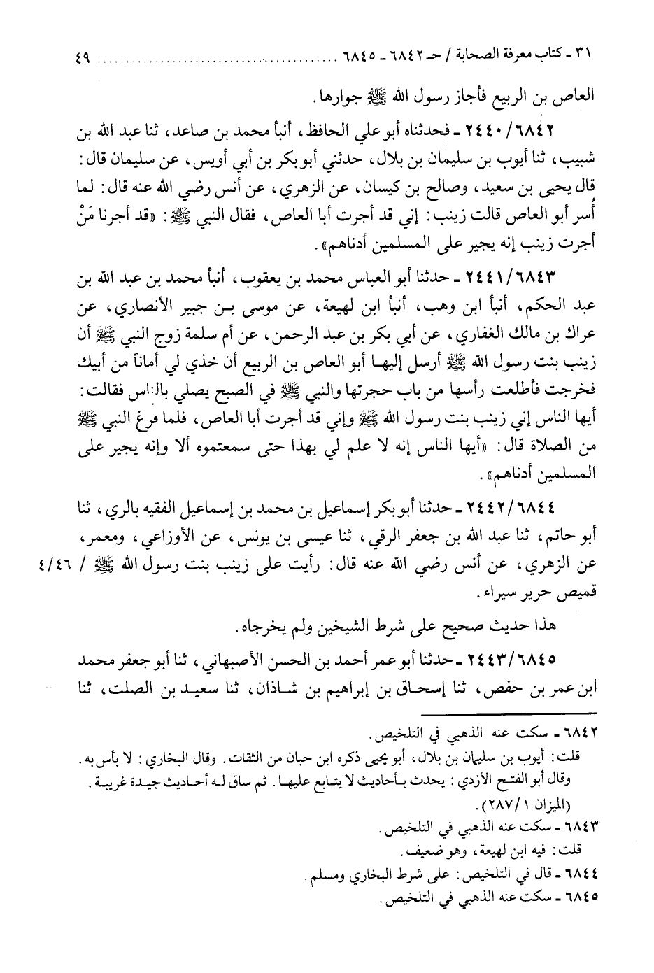 6842 - فَحَدَّثَنَاهُ أَبُو عَلِيٍّ الْحَافِظُ، أنبأ مُحَمَّدُ بْنُ صَاعِدٍ، ثَنَا عَبْدُ اللَّهِ بْنُ شَبِيبٍ، ثَنَا أَيُّوبُ بْنُ سُلَيْمَانَ بْنِ بِلَالٍ، حَدَّثَنِي أَبُو بَكْرِ بْنُ أَبِي أُوَيْسٍ، عَنْ سُلَيْمَانَ، قَالَ: قَالَ يَحْيَى بْنُ سَعِيدٍ، وَصَالِحُ بْنُ كَيْسَانَ، عَنِ الزُّهْرِيِّ، عَنْ أَنَسٍ، رَضِيَ اللَّهُ عَنْهُ قَالَ: لَمَّا أُسِرَ أَبُو الْعَاصِ قَالَتْ زَيْنَبُ: إِنِّي قَدْ أَجَرْتُ أَبَا الْعَاصِ فَقَالَ النَّبِيُّ صَلَّى اللهُ عَلَيْهِ وَسَلَّمَ: «قَدْ §أَجَرْنَا مَنْ أَجَارَتْ زَيْنَبُ، إِنَّهُ يُجِيرُ عَلَى الْمُسْلِمِينَ أَدْنَاهُمْ» K6842 - سكت عنه الذهبي في التلخيص