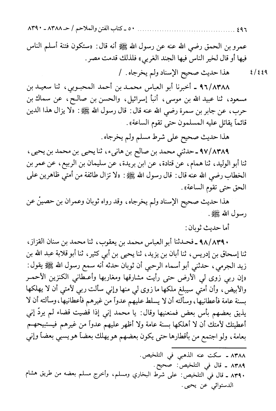 8388 - أَخْبَرَنَا أَبُو الْعَبَّاسِ مُحَمَّدُ بْنُ أَحْمَدَ الْمَحْبُوبِيُّ، ثَنَا سَعِيدُ بْنُ مَسْعُودٍ، ثَنَا عُبَيْدُ اللَّهِ بْنُ مُوسَى، أَنْبَأَ إِسْرَائِيلُ، وَالْحَسَنُ بْنُ صَالِحٍ، عَنْ سِمَاكِ بْنِ حَرْبٍ، عَنْ جَابِرِ بْنِ سَمُرَةَ رَضِيَ اللَّهُ عَنْهُ، قَالَ: قَالَ رَسُولُ اللَّهِ صَلَّى اللهُ عَلَيْهِ وَسَلَّمَ: §«لَا يَزَالُ هَذَا الدِّينُ قَائِمًا يُقَاتِلُ عَلَيْهِ الْمُسْلِمُونَ حَتَّى تَقُومَ السَّاعَةُ» هَذَا حَدِيثٌ صَحِيحٌ عَلَى شَرْطِ مُسْلِمٍ، وَلَمْ يُخْرِجَاهُ "K8388 - سكت عنه الذهبي في التلخيص