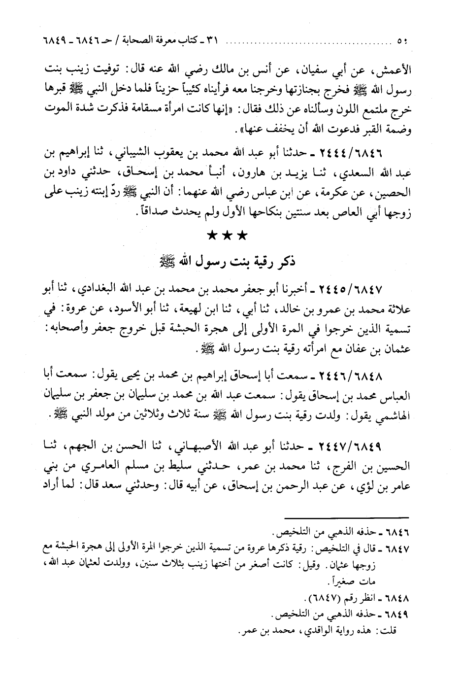 6848 - سَمِعْتُ أَبَا إِسْحَاقَ إِبْرَاهِيمَ بْنَ مُحَمَّدِ بْنِ يَحْيَى، يَقُولُ: سَمِعْتُ أَبَا الْعَبَّاسِ مُحَمَّدَ بْنَ إِسْحَاقَ، يَقُولُ: سَمِعْتُ عَبْدَ اللَّهِ بْنَ مُحَمَّدِ بْنِ سُلَيْمَانَ بْنِ جَعْفَرِ بْنِ سُلَيْمَانَ الْهَاشِمِيَّ، يَقُولُ: §«وُلِدَتْ رُقَيَّةُ بِنْتُ رَسُولِ اللَّهِ صَلَّى اللهُ عَلَيْهِ وَسَلَّمَ سَنَةَ ثَلَاثٍ وَثَلَاثِينَ مِنْ مَوْلِدِ النَّبِيِّ صَلَّى اللهُ عَلَيْهِ وَسَلَّمَ»