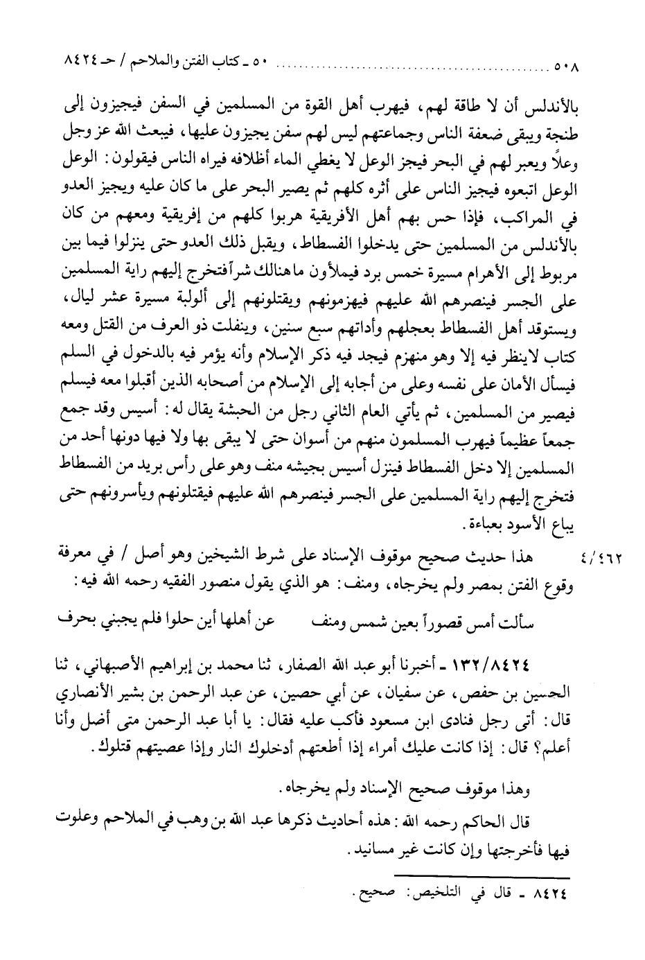 8424 - أَخْبَرَنَا أَبُو عَبْدِ اللَّهِ الصَّفَّارُ، ثَنَا مُحَمَّدُ بْنُ إِبْرَاهِيمَ الْأَصْبَهَانِيُّ، ثَنَا الْحُسَيْنُ بْنُ حَفْصٍ، عَنْ سُفْيَانَ، عَنْ أَبِي حُصَيْنٍ، عَنْ عَبْدِ الرَّحْمَنِ بْنِ بَشِيرٍ الْأَنْصَارِيِّ، قَالَ: أَتَى رَجُلٌ فَنَادَى ابْنَ مَسْعُودٍ فَأَكَبَّ عَلَيْهِ، فَقَالَ: يَا أَبَا عَبْدِ الرَّحْمَنِ مَتَى أَضَلَّ، وَأَنَا أَعْلَمُ؟ قَالَ: «إِذَا كَانَتْ عَلَيْكَ §أُمَرَاءُ إِذَا أَطَعْتَهُمْ أَدْخَلُوكَ النَّارَ، وَإِذَا عَصَيْتَهُمْ قَتَلُوكَ» وَهَذَا مَوْقُوفٌ صَحِيحُ الْإِسْنَادِ وَلَمْ يُخْرِجَاهُ ". قَالَ الْحَاكِمُ رَحِمَهُ اللَّهُ: «هَذِهِ أَحَادِيثُ ذَكَرَهَا عَبْدُ اللَّهِ بْنُ وَهْبٍ فِي الْمَلَاحِمِ، وَعَلَوْتُ فِيهَا فَأَخْرَجْتُهَا، وَإِنْ كَانَتْ غَيْرَ مَسَانِيدَ» K8424 - صحيح