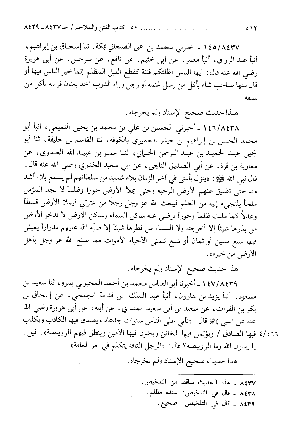 8438 - أَخْبَرَنِي الْحُسَيْنُ بْنُ عَلِيِّ بْنِ مُحَمَّدِ بْنِ يَحْيَى التَّمِيمِيُّ، أَنْبَأَ أَبُو مُحَمَّدٍ الْحَسَنُ بْنُ إِبْرَاهِيمَ بْنِ حَيْدَرَ الْحِمْيَرِيُّ، بِالْكُوفَةِ، ثَنَا الْقَاسِمُ بْنُ خَلِيفَةَ، ثَنَا أَبُو يَحْيَى عَبْدُ الْحَمِيدِ بْنُ عَبْدِ الرَّحْمَنِ الْحِمَّانِيُّ، ثَنَا عُمَرُ بْنُ عُبَيْدِ اللَّهِ الْعَدَوِيُّ، عَنْ مُعَاوِيَةَ بْنِ قُرَّةَ، عَنْ أَبِي الصِّدِّيقِ النَّاجِيِّ، عَنْ أَبِي سَعِيدٍ الْخُدْرِيِّ رَضِيَ اللَّهُ عَنْهُ، قَالَ: قَالَ نَبِيُّ اللَّهِ صَلَّى اللهُ عَلَيْهِ وَسَلَّمَ: §«يَنْزِلُ بِأُمَّتِي فِي آخِرِ الزَّمَانِ بَلَاءٌ شَدِيدٌ مِنْ سُلْطَانِهِمْ لَمْ يُسْمَعْ بَلَاءٌ أَشَدُّ مِنْهُ، حَتَّى تَضِيقَ عَنْهُمُ الْأَرْضُ الرَّحْبَةُ، وَحَتَّى يُمْلَأَ الْأَرْضُ جَوْرًا وَظُلْمًا، لَا يَجِدُ الْمُؤْمِنُ مَلْجَأً يَلْتَجِئُ إِلَيْهِ مِنَ الظُّلْمِ، فَيَبْعَثُ اللَّهُ عَزَّ وَجَلَّ رَجُلًا مِنْ عِتْرَتِي، فَيَمْلَأُ الْأَرْضَ قِسْطًا وَعَدْلًا، كَمَا مُلِئَتْ ظُلْمًا وَجَوْرًا، يَرْضَى عَنْهُ سَاكِنُ السَّمَاءِ وَسَاكِنُ الْأَرْضِ، لَا تَدَّخِرُ الْأَرْضُ مِنْ بَذْرِهَا شَيْئًا إِلَّا أَخْرَجَتْهُ، وَلَا السَّمَاءُ مِنْ قَطْرِهَا شَيْئًا إِلَّا صَبَّهُ اللَّهُ عَلَيْهِمْ مِدْرَارًا، يَعِيشُ فِيهَا سَبْعَ سِنِينَ أَوْ ثَمَانِ أَوْ تِسْعَ، تَتَمَنَّى الْأَحْيَاءُ الْأَمْوَاتَ مِمَّا صَنَعَ اللَّهُ عَزَّ وَجَلَّ بِأَهْلِ الْأَرْضِ مِنْ خَيْرِهِ» هَذَا حَدِيثٌ صَحِيحُ الْإِسْنَادِ، وَلَمْ يُخْرِجَاهُ "K8438 - سنده مظلم
