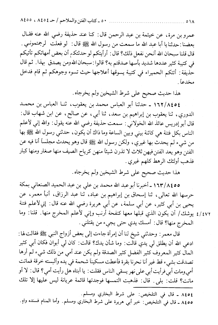 8454 - حَدَّثَنَا أَبُو الْعَبَّاسِ مُحَمَّدُ بْنُ يَعْقُوبَ، ثَنَا الْعَبَّاسُ بْنُ مُحَمَّدٍ الدُّورِيُّ، ثَنَا يَعْقُوبُ بْنُ إِبْرَاهِيمَ بْنِ سَعْدٍ، ثَنَا أَبِي، عَنْ صَالِحٍ، عَنِ ابْنِ شِهَابٍ، قَالَ: قَالَ أَبُو إِدْرِيسَ عَائِذُ اللَّهِ الْخَوْلَانِيُّ: سَمِعْتُ حُذَيْفَةَ رَضِيَ اللَّهُ عَنْهُ، يَقُولُ: " وَاللَّهِ إِنِّي §لَأَعْلَمُ النَّاسِ بِكُلِّ فِتْنَةٍ هِيَ كَائِنَةٌ بَيْنِي وَبَيْنَ السَّاعَةِ، وَمَا ذَاكَ أَنْ يَكُونَ حَدَّثَنِي رَسُولُ اللَّهِ صَلَّى اللهُ عَلَيْهِ وَسَلَّمَ بِهَا مِنْ شَيْءٍ لَمْ يُحَدِّثْ بِهَا غَيْرِي، وَلَكِنْ رَسُولُ اللَّهِ صَلَّى اللهُ عَلَيْهِ وَسَلَّمَ قَالَ: وَهُوَ يُحَدِّثُ مَجْلِسًا أَنَا فِيهِ عَنِ الْفِتَنِ، وَهُوَ «يَعُدُّ الْفِتَنَ فِيهِنَّ ثَلَاثٌ لَا تَذَرُنَّ شَيْئًا مِنْهُنَّ كَرِيَاحِ الصَّيْفِ مِنْهَا صِغَارٌ وَمِنْهَا كِبَارٌ» ، فَذَهَبَ أُولَئِكَ الرَّهْطُ كُلُّهُمْ غَيْرِي «هَذَا حَدِيثٌ صَحِيحٌ عَلَى شَرْطِ الشَّيْخَيْنِ، وَلَمْ يُخْرِجَاهُ» K8454 - على شرط البخاري ومسلم