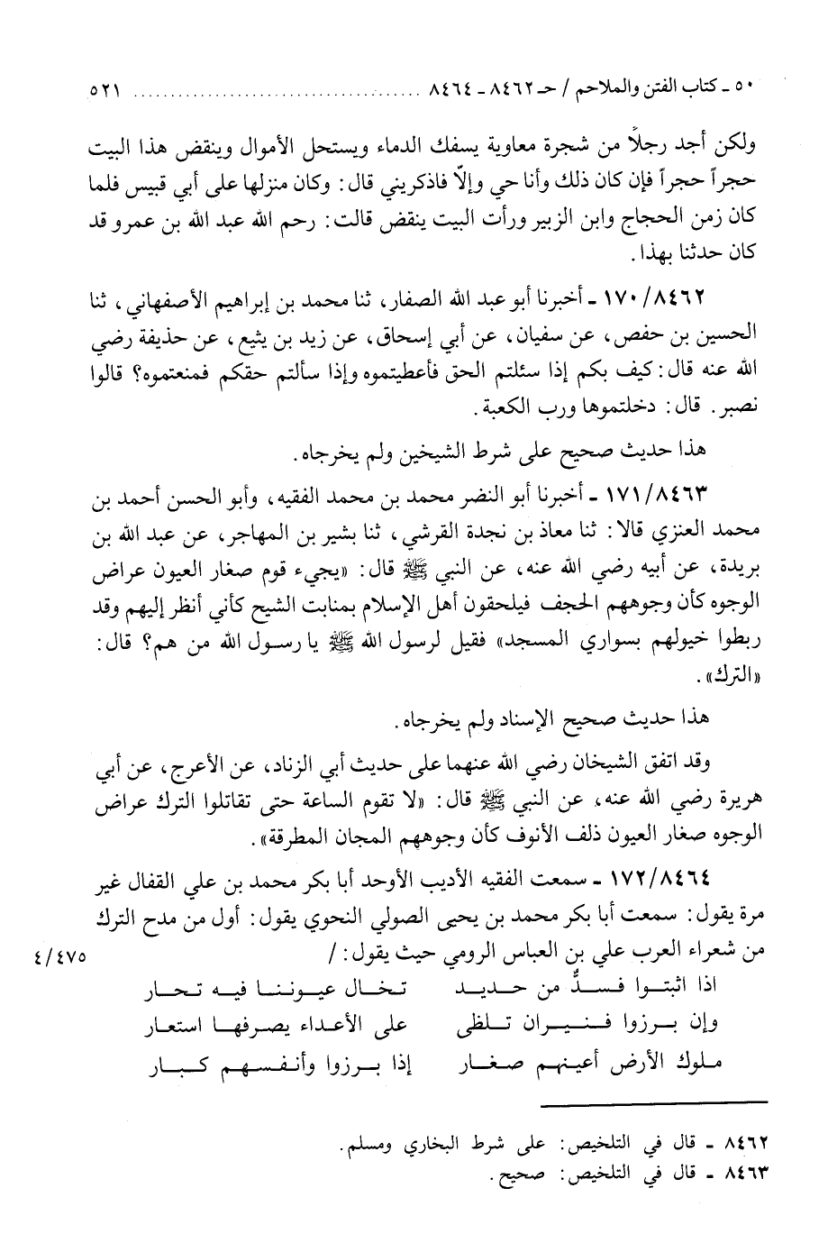 8463 - أَخْبَرَنَا أَبُو النَّضْرِ مُحَمَّدُ بْنُ مُحَمَّدٍ الْفَقِيهُ، وَأَبُو الْحَسَنِ أَحْمَدُ بْنُ مُحَمَّدٍ الْعَنَزِيُّ، قَالَا: ثَنَا مُعَاذُ بْنُ نَجْدَةَ الْقُرَشِيُّ، ثَنَا بَشِيرُ بْنُ الْمُهَاجِرِ، عَنْ عَبْدِ اللَّهِ بْنِ بُرَيْدَةَ، عَنْ أَبِيهِ رَضِيَ اللَّهُ عَنْهُ، عَنِ النَّبِيِّ صَلَّى اللهُ عَلَيْهِ وَسَلَّمَ، قَالَ: «§يَجِيءُ قَوْمٌ صِغَارُ الْعُيُونِ، عِرَاضُ الْوُجُوهِ كَأَنَّ وُجُوهَهُمُ الْحَجَفُ، فَيُلْحِقُونَ أَهْلَ الْإِسْلَامِ بِمَنَابِتِ الشِّيحِ، كَأَنِّي أَنْظُرُ إِلَيْهِمْ وَقَدْ رَبَطُوا خُيُولَهُمْ بِسَوَارِي الْمَسْجِدِ» فَقِيلَ لِرَسُولِ اللَّهِ صَلَّى اللهُ عَلَيْهِ وَسَلَّمَ: يَا رَسُولَ اللَّهِ مَنْ هُمْ؟ قَالَ: «التُّرْكُ» هَذَا حَدِيثٌ صَحِيحُ الْإِسْنَادِ، وَلَمْ يُخْرِجَاهُ وَقَدِ اتَّفَقَ الشَّيْخَانِ رَضِيَ اللَّهُ عَنْهُمَا عَلَى حَدِيثِ أَبِي الزِّنَادِ، عَنِ الْأَعْرَجِ، عَنْ أَبِي هُرَيْرَةَ رَضِيَ اللَّهُ عَنْهُ، عَنِ النَّبِيِّ صَلَّى اللهُ عَلَيْهِ وَسَلَّمَ، قَالَ: «لَا تَقُومُ السَّاعَةُ حَتَّى تُقَاتِلُوا التُّرْكَ عِرَاضَ الْوُجُوهِ صِغَارَ الْعُيُونِ، ذُلْفَ الْأُنُوفِ، كَأَنَّ وُجُوهَهُمُ الْمَجَانُّ الْمُطْرَقَةُ» K8463 - صحيح