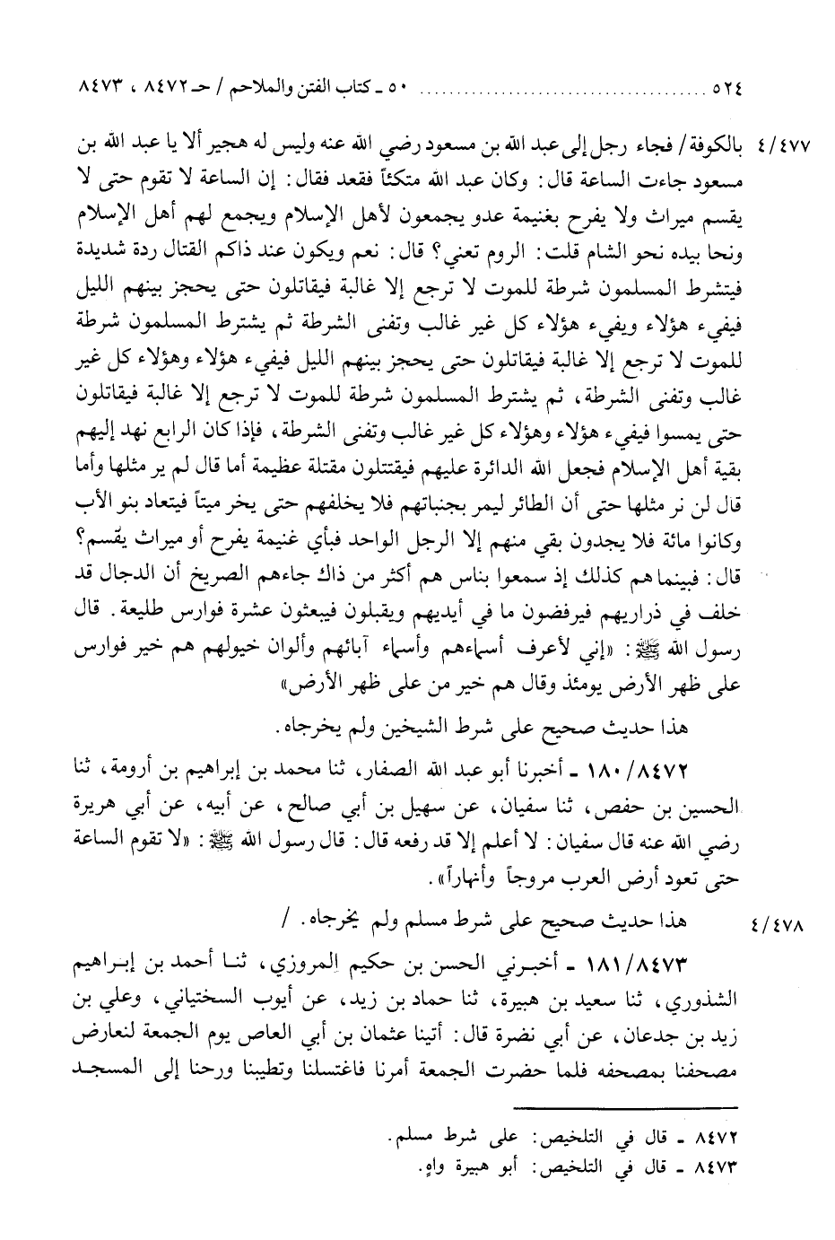 8472 - أَخْبَرَنَا أَبُو عَبْدِ اللَّهِ الصَّفَّارُ، ثَنَا مُحَمَّدُ بْنُ إِبْرَاهِيمَ بْنِ أَرُومَةَ، ثَنَا الْحُسَيْنُ بْنُ حَفْصٍ، ثَنَا سُفْيَانُ، عَنْ سُهَيْلِ بْنِ أَبِي صَالِحٍ، عَنْ أَبِيهِ، عَنْ أَبِي هُرَيْرَةَ رَضِيَ اللَّهُ عَنْهُ، قَالَ سُفْيَانُ: لَا أَعْلَمُ إِلَّا قَدْ رَفَعَهُ، قَالَ: قَالَ رَسُولُ اللَّهِ صَلَّى اللهُ عَلَيْهِ وَسَلَّمَ: §«لَا تَقُومُ السَّاعَةُ حَتَّى تَعُودَ أَرْضُ الْعَرَبِ مُرُوجًا وَأَنْهَارًا» هَذَا حَدِيثٌ صَحِيحٌ عَلَى شَرْطِ مُسْلِمٍ، وَلَمْ يُخْرِجَاهُ "K8472 - على شرط مسلم