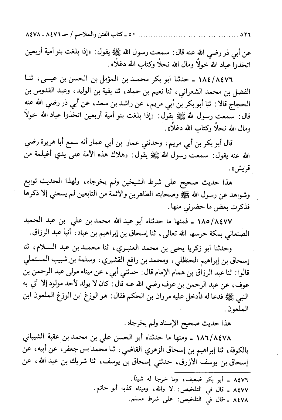 8476 - حَدَّثَنَا أَبُو بَكْرٍ مُحَمَّدُ بْنُ الْمُؤَمَّلِ بْنِ الْحَسَنِ بْنِ عِيسَى، ثَنَا الْفَضْلُ بْنُ مُحَمَّدٍ الشَّعْرَانِيُّ، ثَنَا نُعَيْمُ بْنُ حَمَّادٍ، ثَنَا بَقِيَّةُ بْنُ الْوَلِيدِ، وَعَبْدُ الْقُدُّوسِ بْنُ الْحَجَّاجِ، قَالَا: ثَنَا أَبُو بَكْرِ بْنُ أَبِي مَرْيَمَ، عَنْ رَاشِدِ بْنِ سَعْدٍ، عَنْ أَبِي ذَرٍّ رَضِيَ اللَّهُ عَنْهُ، قَالَ: سَمِعْتُ رَسُولَ اللَّهِ صَلَّى اللهُ عَلَيْهِ وَسَلَّمَ، يَقُولُ: §«إِذَا بَلَغَتْ بَنُو أُمَيَّةَ أَرْبَعِينَ اتَّخَذُوا عِبَادَ اللَّهِ خَوَلًا، وَمَالَ اللَّهِ نِحَلًا، وَكِتَابَ اللَّهِ دَغَلًا»