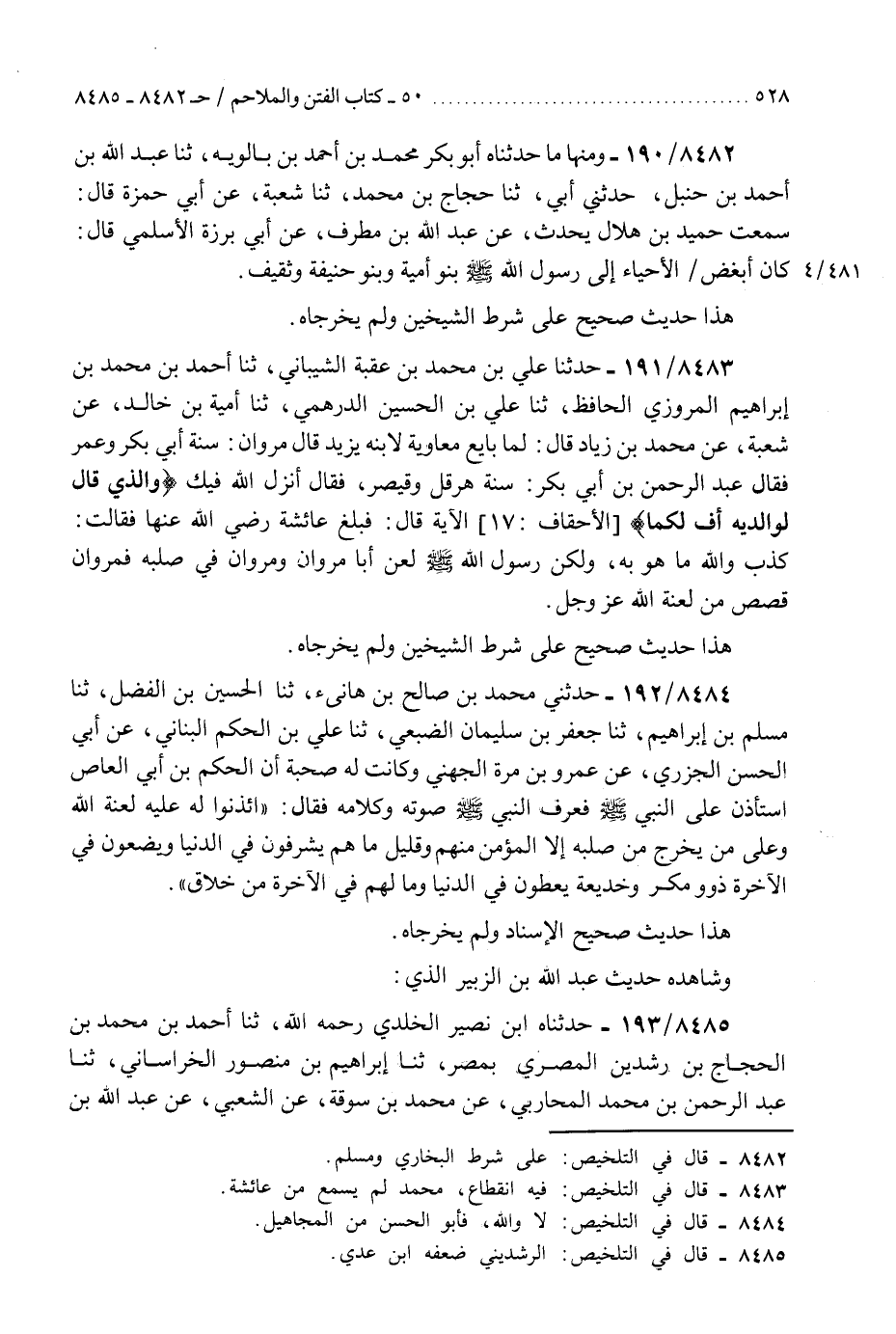 8485 - حَدَّثَنَاهُ ابْنُ نُصَيْرٍ الْخَلَدِيُّ رَحِمَهُ اللَّهُ، ثَنَا أَحْمَدُ بْنُ مُحَمَّدِ بْنِ الْحَجَّاجِ بْنِ رِشْدِينَ الْمِصْرِيُّ بِمِصْرَ، ثَنَا إِبْرَاهِيمُ بْنُ مَنْصُورٍ الْخُرَاسَانِيُّ، ثَنَا عَبْدُ الرَّحْمَنِ بْنُ مُحَمَّدٍ الْمُحَارِبِيُّ، عَنْ مُحَمَّدِ بْنِ سَوْقَةَ، عَنِ الشَّعْبِيِّ، عَنْ عَبْدِ اللَّهِ بْنِ الزُّبَيْرِ رَضِيَ اللَّهُ عَنْهُمَا: «أَنَّ رَسُولَ اللَّهِ صَلَّى اللهُ عَلَيْهِ وَسَلَّمَ §لَعَنَ الْحَكَمَ وَوَلَدَهُ» هَذَا الْحَدِيثٌ صَحِيحُ الْإِسْنَادِ، وَلَمْ يُخْرِجَاهُ " قَالَ الْحَاكِمُ رَحِمَهُ اللَّهُ تَعَالَى: «لِيَعْلَمَ طَالِبُ الْعِلْمِ أَنَّ هَذَا بَابٌ لَمْ أَذْكُرْ فِيهِ ثُلُثَ مَا رُوِيَ، وَأَنَّ أَوَّلَ الْفِتَنِ فِي هَذِهِ الْأُمَّةِ فِتْنَتُهُمْ، وَلَمْ يَسَعْنِي فِيمَا بَيْنِي وَبَيْنَ اللَّهِ أَنْ أُخَلِّيَ الْكِتَابَ مِنْ ذِكْرِهِمْ» K8485 - الرشديني ضعفه ابن عدي