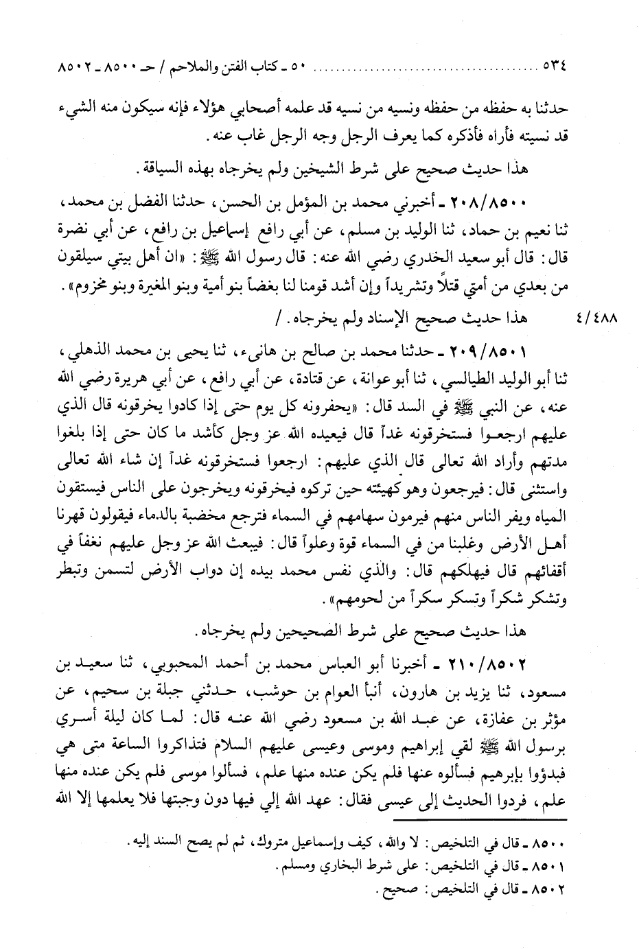 8502 - أَخْبَرَنَا أَبُو الْعَبَّاسِ مُحَمَّدُ بْنُ أَحْمَدَ الْمَحْبُوبِيُّ، ثَنَا سَعِيدُ بْنُ مَسْعُودٍ، ثَنَا يَزِيدُ بْنُ هَارُونَ، أَنْبَأَ الْعَوَّامُ بْنُ حَوْشَبٍ، حَدَّثَنِي جَبَلَةُ بْنُ سُحَيْمٍ، عَنْ مُؤْثِرِ بْنِ عَفَازَةَ، عَنْ عَبْدِ اللَّهِ بْنِ مَسْعُودٍ رَضِيَ اللَّهُ عَنْهُ، قَالَ: §" لَمَّا كَانَ لَيْلَةُ أُسْرِيَ بِرَسُولِ اللَّهِ صَلَّى اللهُ عَلَيْهِ وَسَلَّمَ، لَقِيَ إِبْرَاهِيمَ، وَمُوسَى، وَعِيسَى عَلَيْهِمُ السَّلَامُ، فَتَذَاكَرُوا السَّاعَةَ مَتَى هِيَ، فَبَدَأُوا بِإِبْرَاهِيمَ فَسَأَلُوهُ عَنْهَا، فَلَمْ يَكُنْ عِنْدَهُ مِنْهَا عَلْمٌ، فَسَأَلُوا مُوسَى فَلَمْ يَكُنْ عِنْدَهُ مِنْهَا عَلْمٌ، فَرَدُّوا الْحَدِيثَ إِلَى عِيسَى، فَقَالَ: عَهْدُ اللَّهِ إِلَيَّ فِيهَا دُونَ وَجْبَتِهَا، فَلَا يَعْلَمُهَا إِلَّا اللَّهُ عَزَّ وَجَلَّ، فَذَكَرَ خُرُوجَ الدَّجَّالِ وَقَالَ: فَأَهْبِطُ فَأَقْتُلُهُ، ثُمَّ يَرْجِعُ النَّاسُ إِلَى بِلَادِهِمْ، فَيَسْتَقْبِلُهُمْ يَأْجُوجُ وَمَأْجُوجُ وَهُمْ مِنْ كُلِّ حَدَبٍ يَنْسِلُونَ، لَا يَمُرُّونَ بِمَاءٍ إِلَّا شَرِبُوهُ وَلَا بِشَيْءٍ إِلَّا أَفْسَدُوهُ فَيَجْأَرُونَ إِلَيَّ فَأَدْعُو اللَّهَ فَيُمِيتُهُمْ فَتَخْوَى الْأَرْضُ مِنْ رِيحِهِمْ، فَيَجْأَرُونَ إِلَيَّ فَأَدْعُوا اللَّهَ فَيُرْسِلُ السَّمَاءَ بِالْمَاءِ فَيَحْمِلُهُمْ، فَيَقْذِفُ بِأَجْسَامِهِمْ فِي الْبَحْرِ، ثُمَّ تُنْسَفُ الْجِبَالُ وَتُمَدُّ الْأَرْضُ مَدَّ الْأَدِيمِ، فَعَهْدُ اللَّهِ إِلَيَّ أَنَّهُ إِذَا كَانَ ذَلِكَ أَنَّ السَّاعَةَ مِنَ النَّاسِ كَالْحَامِلِ الْمُتِمِّ، لَا يَدْرِي أَهْلُهَا مَتَى تَفْجَأُهُمْ بِوِلَادَتِهَا لَيْلًا أَوْ نَهَارًا " قَالَ الْعَوَّامُ: " فَوَجَدْتُ تَصْدِيقَ ذَلِكَ فِي كِتَابِ اللَّهِ عَزَّ وَجَلَّ، ثُمَّ قَرَأَ: {حَتَّى إِذَا فُتِحَتْ يَأْجُوجُ وَمَأْجُوجُ وَهُمْ مِنْ كُلِّ حَدَبٍ يَنْسِلُونَ وَاقْتَرَبَ الْوَعْدُ الْحَقُّ} [الأنبياء: 97] «هَذَا حَدِيثٌ صَحِيحُ الْإِسْنَادِ، وَلَمْ يُخْرِجَاهُ» K8502 - صحيح