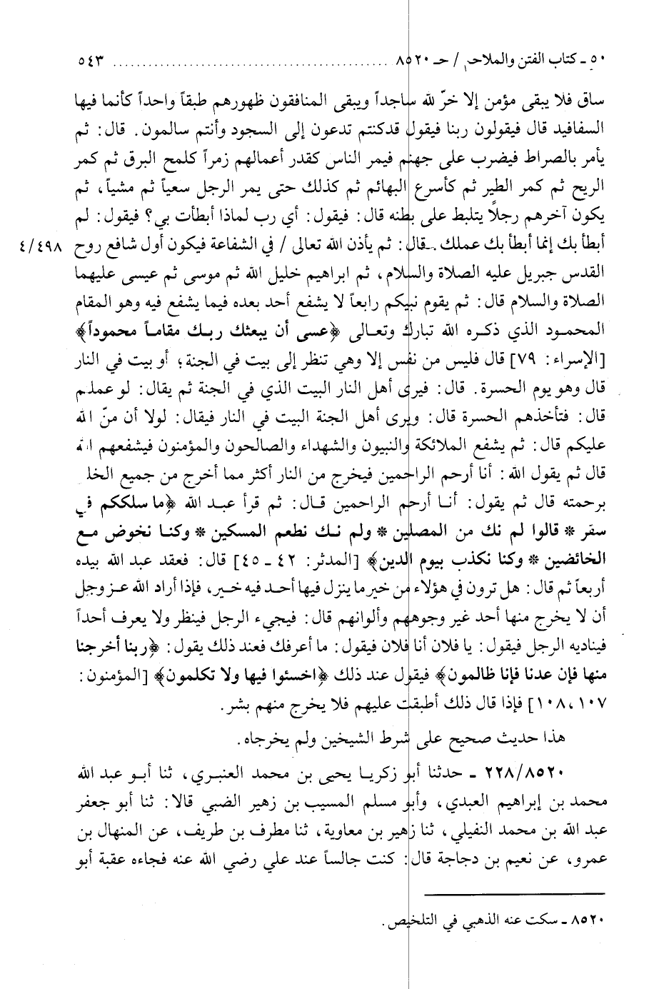 8520 - حَدَّثَنَا أَبُو زَكَرِيَّا يَحْيَى بْنُ مُحَمَّدٍ الْعَنْبَرِيُّ، ثَنَا أَبُو عَبْدِ اللَّهِ مُحَمَّدُ بْنُ إِبْرَاهِيمَ الْعَبْدِيُّ، وَأَبُو مُسْلِمٍ الْمُسَيِّبُ بْنُ زُهَيْرٍ الضَّبِّيُّ، قَالَا: ثَنَا أَبُو جَعْفَرٍ عَبْدُ اللَّهِ بْنُ مُحَمَّدٍ النُّفَيْلِيُّ، ثَنَا زُهَيْرُ بْنُ مُعَاوِيَةَ، ثَنَا مُطَرِّفُ بْنُ طَرِيفٍ، عَنِ الْمِنْهَالِ بْنِ عَمْرٍو، عَنْ نُعَيْمِ بْنِ دَجَاجَةَ، قَالَ: كُنْتُ جَالِسًا عِنْدَ عَلِيٍّ رَضِيَ اللَّهُ عَنْهُ، فَجَاءَهُ عُقْبَةُ أَبُو مَسْعُودٍ، فَقَالَ لَهُ عَلِيٌّ: يَا فَرُّوخُ أَنْتَ الْقَائِلُ أَوْ مَا أَنَّكَ الْمُفْتِي تُفْتِي النَّاسَ. قَالَ: أَمَا إِنِّي لَأُخْبِرُهُمُ الْآخِرُ وَالْآخِرُ شَرٌّ، قَالَ: فَحَدِّثْنَا مَا سَمِعْتَ رَسُولَ اللَّهِ صَلَّى اللهُ عَلَيْهِ وَسَلَّمَ، يَقُولُ فِي الْمِائَةِ، فَقَالَ: سَمِعْتُ رَسُولَ اللَّهِ صَلَّى اللهُ عَلَيْهِ وَسَلَّمَ، يَقُولُ: §«لَا تَكُونُ مِائَةُ سَنَةٍ وَعَلَى الْأَرْضِ عَيْنٌ تَطْرِفُ» فَقَالَ: «إِنَّكَ قَدْ أَخْطَأْتَ وَأَخْطَأْتَ فِي أَوَّلِ فَتْوَاكَ إِنَّمَا ذَلِكَ لِمَنْ هُوَ يَوْمَئِذٍ حَيٌّ، وَهَلِ الرَّخَاءُ وَالْفَرَجُ إِلَّا بَعْدَ الْمِائَةِ؟» K8520 - سكت عنه الذهبي في التلخيص