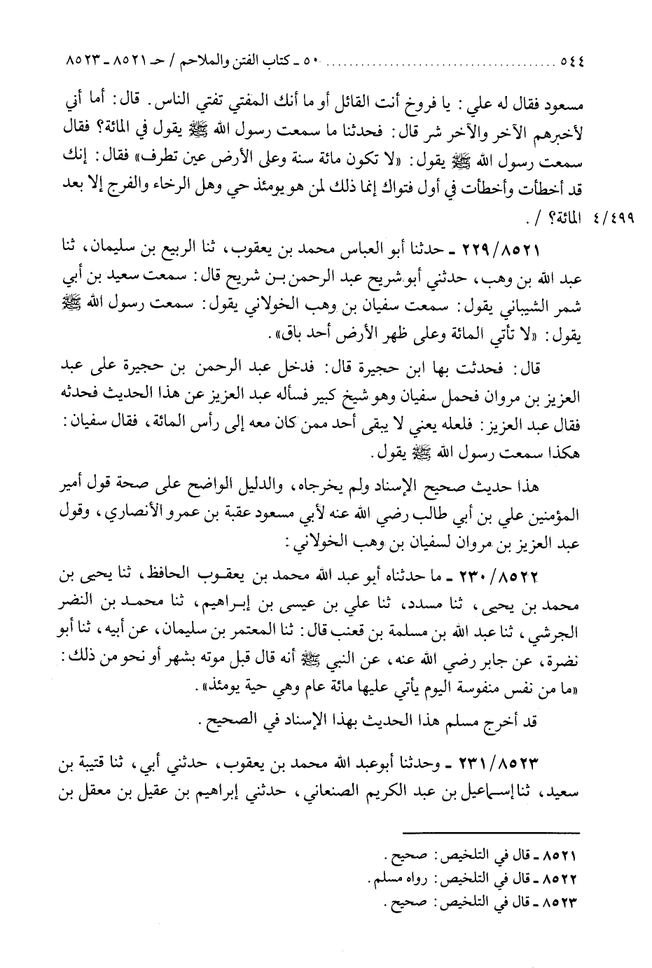 8521 - حَدَّثَنَا أَبُو الْعَبَّاسِ مُحَمَّدُ بْنُ يَعْقُوبَ، ثَنَا الرَّبِيعُ بْنُ سُلَيْمَانَ، ثَنَا عَبْدُ اللَّهِ بْنُ وَهْبٍ، حَدَّثَنِي أَبُو شُرَيْحٍ عَبْدُ الرَّحْمَنِ بْنُ شُرَيْحٍ، قَالَ: سَمِعْتُ سَعِيدَ بْنَ أَبِي شَمِرٍ الشَّيْبَانِيَّ، يَقُولُ: سَمِعْتُ سُفْيَانَ بْنَ وَهْبٍ الْخَوْلَانِيَّ، يَقُولُ: سَمِعْتُ رَسُولَ اللَّهِ صَلَّى اللهُ عَلَيْهِ وَسَلَّمَ، يَقُولُ: §«لَا تَأْتِي الْمِائَةُ وَعَلَى ظَهْرِ الْأَرْضِ أَحَدٌ بَاقٍ» قَالَ: فَحَدَّثْتُ بِهَا ابْنَ حُجَيْرَةَ، قَالَ: فَدَخَلَ عَبْدُ الرَّحْمَنِ بْنُ حُجَيْرَةَ عَلَى عَبْدِ الْعَزِيزِ بْنِ مَرْوَانَ فَحَمَلَ سُفْيَانَ وَهُوَ شَيْخٌ كَبِيرٌ، فَسَأَلَهُ عَبْدُ الْعَزِيزِ عَنْ هَذَا الْحَدِيثِ، فَحَدَّثَهُ فَقَالَ عَبْدُ الْعَزِيزِ: فَلَعَلَّهُ يَعْنِي لَا يَبْقَى أَحَدٌ مِمَّنْ كَانَ مَعَهُ إِلَى رَأْسِ الْمِائَةِ، فَقَالَ سُفْيَانُ: هَكَذَا سَمِعْتُ رَسُولَ اللَّهِ صَلَّى اللهُ عَلَيْهِ وَسَلَّمَ يَقُولُ «هَذَا حَدِيثٌ صَحِيحُ الْإِسْنَادِ، وَلَمْ يُخْرِجَاهُ» وَالدَّلِيلُ الْوَاضِحُ عَلَى صِحَّةِ قَوْلِ أَمِيرِ الْمُؤْمِنِينَ عَلِيِّ بْنِ أَبِي طَالِبٍ رَضِيَ اللَّهُ عَنْهُ لِأَبِي مَسْعُودٍ عُقْبَةَ بْنِ عَمْرٍو الْأَنْصَارِيِّ، وَقَوْلِ عَبْدِ الْعَزِيزِ بْنِ مَرْوَانَ لِسُفْيَانَ بْنِ وَهْبٍ الْخَوْلَانِيِّ "K8521 - صحيح