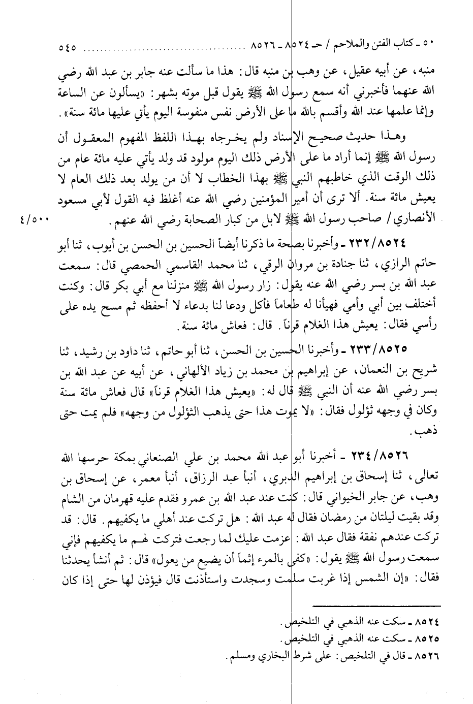 8525 - وَأَخْبَرَنَا الْحُسَيْنُ بْنُ الْحَسَنِ، ثَنَا أَبُو حَاتِمٍ، ثَنَا دَاوُدُ بْنُ رُشَيْدٍ، ثَنَا شُرَيْحُ بْنُ النُّعْمَانِ، عَنْ إِبْرَاهِيمَ بْنِ مُحَمَّدِ بْنِ زِيَادٍ الْأَلْهَانِيِّ، عَنْ أَبِيهِ، عَنْ عَبْدِ اللَّهِ بْنِ بُسْرٍ رَضِيَ اللَّهُ عَنْهُ، أَنَّ النَّبِيَّ صَلَّى اللهُ عَلَيْهِ وَسَلَّمَ، قَالَ لَهُ: «§يَعِيشُ هَذَا الْغُلَامُ قَرْنًا» ، قَالَ: فَعَاشَ مِائَةَ سَنَةٍ وَكَانَ فِي وَجْهِهِ ثُؤْلُولٌ، فَقَالَ: «لَا يَمُوتُ هَذَا حَتَّى يَذْهَبَ الثُّؤْلُولُ مِنْ وَجْهِهِ» فَلَمْ يَمُتْ حَتَّى ذَهَبَK8525 - سكت عنه الذهبي في التلخيص