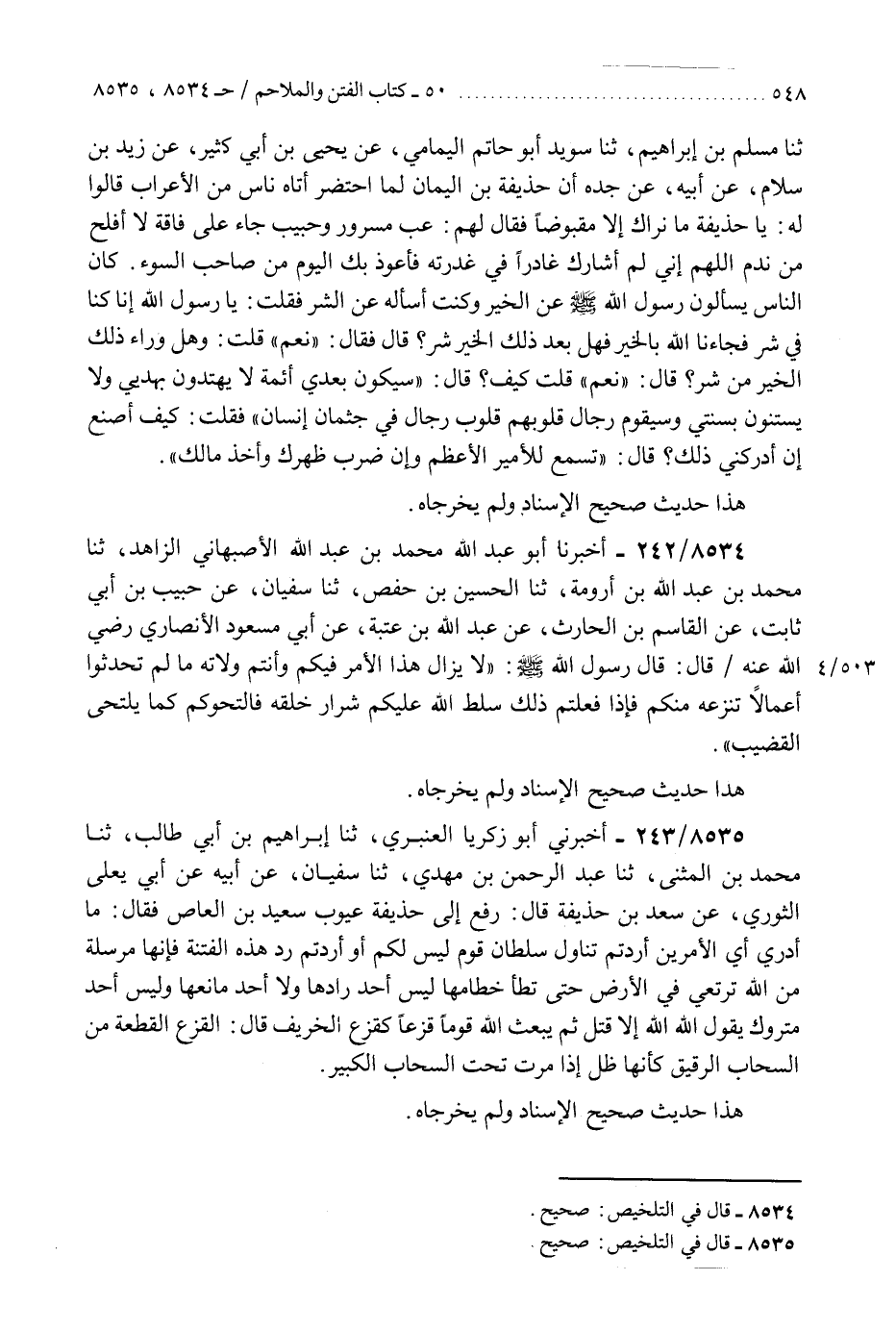 8535 - أَخْبَرَنِي أَبُو زَكَرِيَّا الْعَنْبَرِيُّ، ثَنَا إِبْرَاهِيمُ بْنُ أَبِي طَالِبٍ، ثَنَا مُحَمَّدُ بْنُ الْمُثَنَّى، ثَنَا عَبْدُ الرَّحْمَنِ بْنُ مَهْدِيٍّ، ثَنَا سُفْيَانُ، عَنْ أَبِيهِ، عَنْ أَبِي يَعْلَى الثَّوْرِيِّ، عَنْ سَعْدِ بْنِ حُذَيْفَةَ، قَالَ: رُفِعَ إِلَى حُذَيْفَةَ عُيُوبُ سَعِيدِ بْنِ الْعَاصِ فَقَالَ: §" مَا أَدْرِي أَيَّ الْأَمْرَيْنِ أَرَدْتُمْ تَنَاوُلَ سُلْطَانِ قَوْمٍ لَيْسَ لَكُمْ، أَوْ أَرَدْتُمْ رَدَّ هَذِهِ الْفِتْنَةِ، فَإِنَّهَا مُرْسَلَةٌ مِنَ اللَّهِ تَرْتَعِي فِي الْأَرْضِ حَتَّى تَطَأَ خِطَامَهَا، لَيْسَ أَحَدٌ رَادَّهَا وَلَا أَحَدٌ مَانِعَهَا، وَلَيْسَ أَحَدٌ مَتْرُوكٌ يَقُولُ: اللَّهَ اللَّهَ إِلَّا قُتِلَ، ثُمَّ يَبْعَثُ اللَّهُ قَوْمًا قُزُعًا كَقَزَعِ الْخَرِيفِ " قَالَ: «الْقَزَعُ الْقِطْعَةُ مِنَ السَّحَابِ الرَّقِيقِ كَأَنَّهَا ظِلٌّ إِذَا مَرَّتْ تَحْتَ السَّحَابِ الْكَبِيرِ» هَذَا حَدِيثٌ صَحِيحُ الْإِسْنَادِ، وَلَمْ يُخْرِجَاهُ "K8535 - صحيح