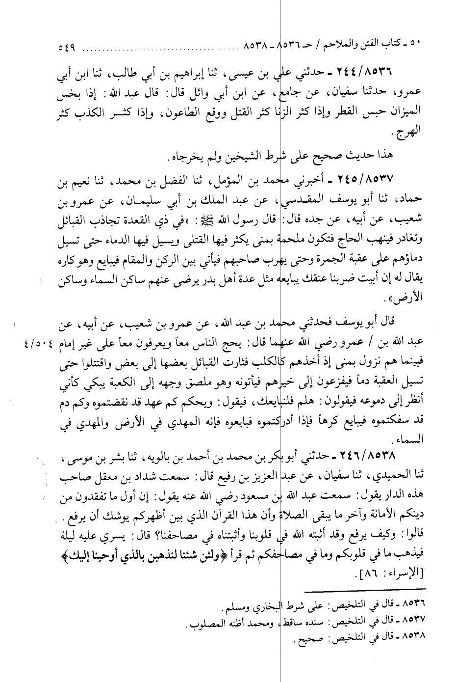8537 - أَخْبَرَنِي مُحَمَّدُ بْنُ الْمُؤَمَّلِ، ثَنَا الْفَضْلُ بْنُ مُحَمَّدٍ، ثَنَا نُعَيْمُ بْنُ حَمَّادٍ، ثَنَا أَبُو يُوسُفَ الْمَقْدِسِيُّ، عَنْ عَبْدِ الْمَلِكِ بْنِ أَبِي سُلَيْمَانَ، عَنْ عَمْرِو بْنِ شُعَيْبٍ، عَنْ أَبِيهِ، عَنْ جَدِّهِ، قَالَ: قَالَ رَسُولُ اللَّهِ صَلَّى اللهُ عَلَيْهِ وَسَلَّمَ: " §فِي ذِي الْقَعْدَةِ تُجَاذِبُ الْقَبَائِلُ وَتُغَادِرُ، فَيُنْهَبُ الْحَاجُّ، فَتَكُونُ مَلْحَمَةٌ بِمِنًى، يَكْثُرُ فِيهَا الْقَتْلَى، وَيَسِيلُ فِيهَا الدِّمَاءُ، حَتَّى تَسِيلَ دِمَاؤُهُمْ عَلَى عَقَبَةِ الْجَمْرَةِ، وَحَتَّى يَهْرُبَ صَاحِبُهُمْ فَيَأْتِي بَيْنَ الرُّكْنِ وَالْمَقَامِ، فَيُبَايَعُ وَهُوَ كَارِهٌ، يُقَالُ لَهُ: إِنْ أَبِيتَ ضَرَبْنَا عُنُقَكَ، يُبَايِعُهُ مِثْلُ عِدَّةِ أَهْلِ بَدْرٍ يَرْضَى عَنْهُمْ سَاكِنُ السَّمَاءِ وَسَاكِنُ الْأَرْضِ " قَالَ أَبُو يُوسُفَ: فَحَدَّثَنِي مُحَمَّدُ بْنُ عَبْدِ اللَّهِ، عَنْ عَمْرِو بْنِ شُعَيْبٍ، عَنْ أَبِيهِ، عَنْ عَبْدِ اللَّهِ بْنِ عَمْرٍو رَضِيَ اللَّهُ عَنْهُمَا، قَالَ: " يَحُجُّ النَّاسُ مَعًا وَيُعَرِّفُونَ مَعًا عَلَى غَيْرِ إِمَامٍ، فَبَيْنَمَا هُمْ نُزُولٌ بِمِنًى إِذْ أَخَذَهُمْ كَالْكَلَبِ، فَثَارَتِ الْقَبَائِلُ بَعْضُهَا إِلَى بَعْضٍ، وَاقْتَتَلُوا حَتَّى تَسِيلَ الْعَقَبَةُ دَمًا، فَيَفْزَعُونَ إِلَى خَيْرِهِمْ، فَيَأْتُونَهُ وَهُوَ مُلْصِقٌ وَجْهَهُ إِلَى الْكَعْبَةِ يَبْكِي كَأَنِّي أَنْظُرُ إِلَى دُمُوعِهِ، فَيَقُولُونَ: هَلُمَّ فَلْنُبَايِعَكَ، فَيَقُولُ: وَيْحَكُمْ كَمْ عَهْدٍ قَدْ نَقَضْتُمُوهُ وَكَمْ دَمٍ قَدْ سَفَكْتَمُوهُ، فَيُبَايَعُ كَرْهًا فَإِذَا أَدْرَكْتُمُوهُ فَبَايِعُوهُ فَإِنَّهُ الْمَهْدِيُّ فِي الْأَرْضِ، وَالْمَهْدِيُّ فِي السَّمَاءِ "K8537 - سنده ساقط