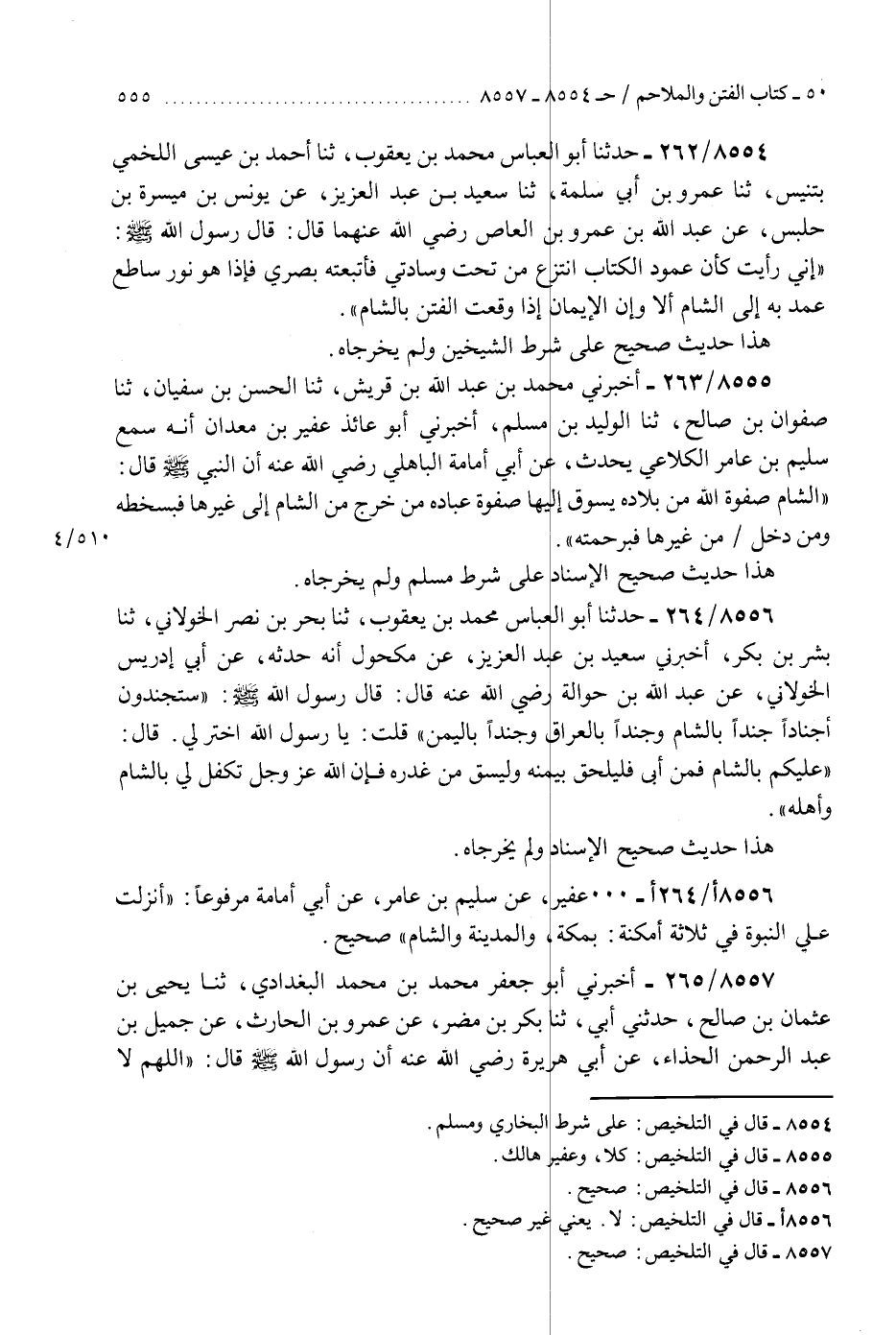 8554 - حَدَّثَنَا أَبُو الْعَبَّاسِ مُحَمَّدُ بْنُ يَعْقُوبَ، ثَنَا أَحْمَدُ بْنُ عِيسَى اللَّخْمِيُّ، بِتِنِّيسَ، ثَنَا عَمْرُو بْنُ أَبِي سَلَمَةَ، ثَنَا سَعِيدُ بْنُ عَبْدِ الْعَزِيزِ، عَنْ يُونُسَ بْنِ مَيْسَرَةَ بْنِ حَلْبَسَ، عَنْ عَبْدِ اللَّهِ بْنِ عَمْرِو بْنِ الْعَاصِ رَضِيَ اللَّهُ عَنْهُمَا، قَالَ: قَالَ رَسُولُ اللَّهِ صَلَّى اللهُ عَلَيْهِ وَسَلَّمَ: «إِنِّي §رَأَيْتُ كَأَنَّ عَمُودَ الْكِتَابِ انْتُزِعَ مِنْ تَحْتِ وِسَادَتِي، فَأَتْبَعْتُهُ بَصَرِي فَإِذَا هُوَ نُورٌ سَاطِعٌ عُمِدَ بِهِ إِلَى الشَّامِ، أَلَا وَإِنَّ الْإِيمَانَ إِذَا وَقَعَتِ الْفِتَنُ بِالشَّامِ» هَذَا حَدِيثٌ صَحِيحٌ عَلَى شَرْطِ الشَّيْخَيْنِ، وَلَمْ يُخْرِجَاهُ "K8554 - على شرط البخاري ومسلم