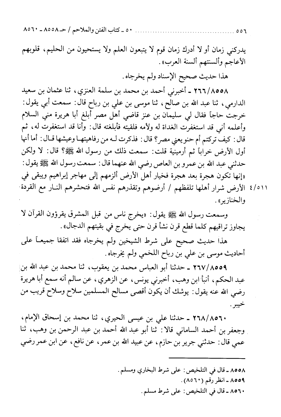 8558 - أَخْبَرَنِي أَحْمَدُ بْنُ مُحَمَّدِ بْنِ سَلَمَةَ الْعَنَزِيُّ، ثَنَا عُثْمَانُ بْنُ سَعِيدٍ الدَّارِمِيُّ، ثَنَا عَبْدُ اللَّهِ بْنُ صَالِحٍ، ثَنَا مُوسَى بْنُ عَلِيِّ بْنِ رَبَاحٍ، قَالَ: سَمِعْتُ أَبِي، يَقُولُ: خَرَجْتُ حَاجًّا، فَقَالَ لِي سُلَيْمَانُ بْنُ عَنَزٍ قَاضِي أَهْلِ مِصْرَ: أَبْلِغْ أَبَا هُرَيْرَةَ مِنِّي السَّلَامَ، وَأَعْلِمْهُ أَنِّي قَدِ اسْتَغْفَرْتُ الْغَدَاةَ لَهُ وَلِأُمِّهِ، فَلَقِيتُهُ فَأَبْلَغْتُهُ، قَالَ: وَأَنَا قَدِ اسْتَغْفَرْتُ لَهُ، ثُمَّ قَالَ: كَيْفَ تَرَكْتُمْ أُمَّ حَنْوٍ - يَعْنِي مِصْرَ -؟ قَالَ: فَذَكَرْتُ لَهُ مِنْ رَفَاهِيَتِهَا وَعَيْشِهَا، قَالَ: أَمَا إِنَّهَا أَوَّلُ الْأَرْضِ خَرَابًا، ثُمَّ أَرْمِينِيَةُ، قُلْتُ: سَمِعْتَ ذَلِكَ مِنْ رَسُولِ اللَّهِ صَلَّى اللهُ عَلَيْهِ وَسَلَّمَ؟ قَالَ: لَا، وَلَكِنْ، حَدَّثَنِي عَبْدُ اللَّهِ بْنُ عَمْرِو بْنِ الْعَاصِ رَضِيَ اللَّهُ عَنْهُمَا، قَالَ: سَمِعْتُ رَسُولَ اللَّهِ صَلَّى اللهُ عَلَيْهِ وَسَلَّمَ، يَقُولُ: «إِنَّهَا §تَكُونُ هِجْرَةٌ بَعْدَ هِجْرَةٍ، فَخِيَارُ أَهْلِ الْأَرْضِ أَلْزَمُهُمْ إِلَى مُهَاجَرِ إِبْرَاهِيمَ، وَيَبْقَى فِي الْأَرْضِ شِرَارُ أَهْلِهَا تَلْفِظُهُمْ أَرْضُوهُمْ، وَتُقَذِّرُهُمْ نَفْسُ اللَّهِ فَتَحْشُرُهُمُ النَّارُ مَعَ الْقِرَدَةِ وَالْخَنَازِيرِ» K8558 - على شرط البخاري ومسلم
